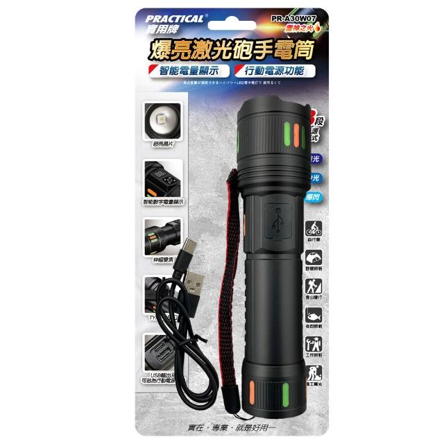 PRACTICAL 實用牌爆亮激光炮鋁合金手電筒-電量顯示/2000流明/三段光源/伸縮變焦/附充電線 (單品/組合)