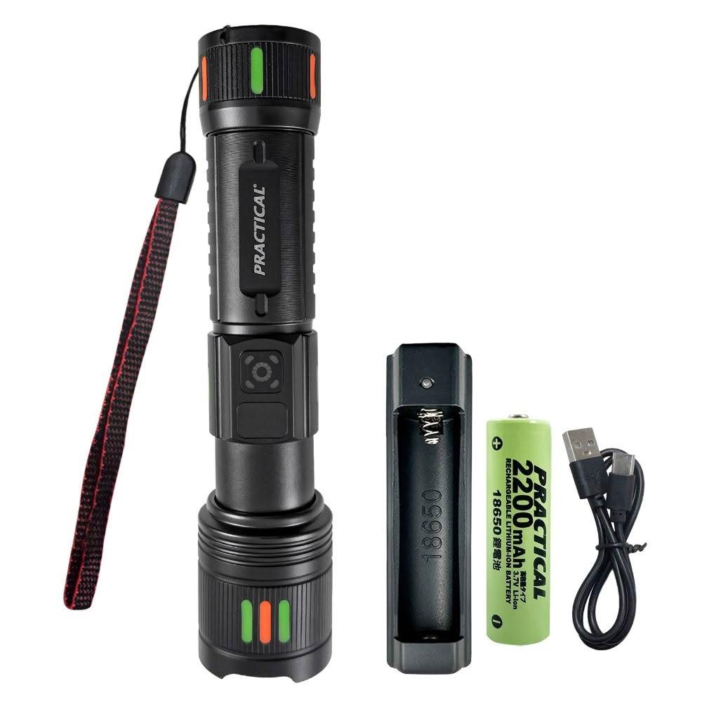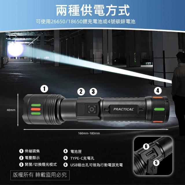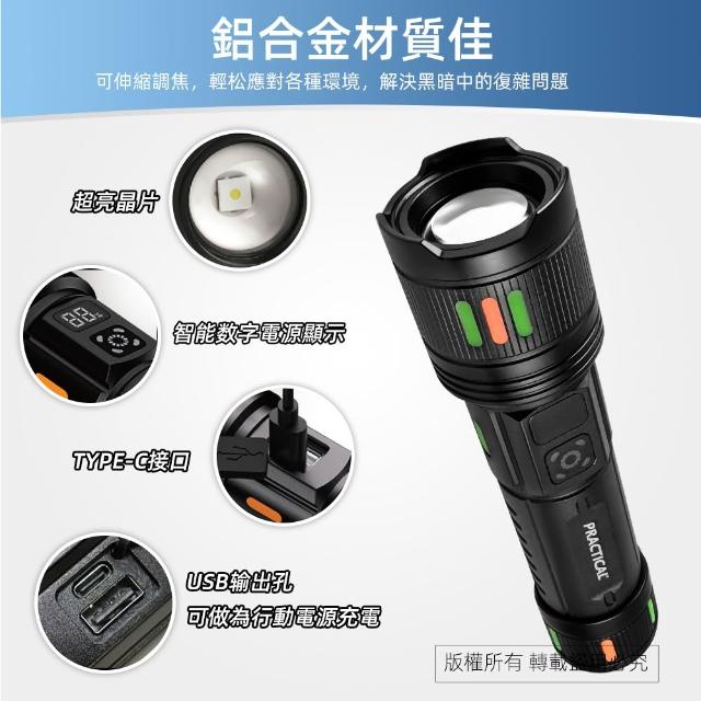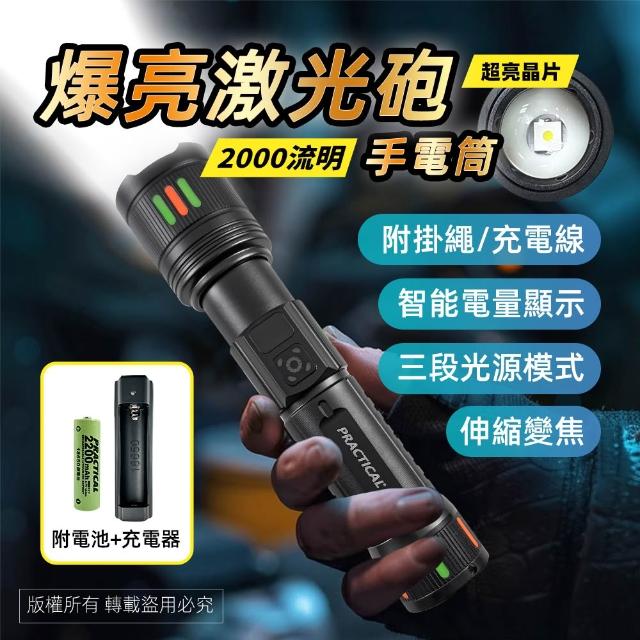 PRACTICAL 實用牌爆亮激光炮鋁合金手電筒-電量顯示/2000流明/三段光源/伸縮變焦/附充電線 (單品/組合)