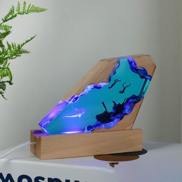 Eco森活3D立體海洋微景觀 樹脂小夜燈 樹脂燈 夜光燈 喬遷禮 桌面擺設 海洋小夜燈 實木燈座工藝品