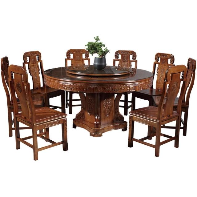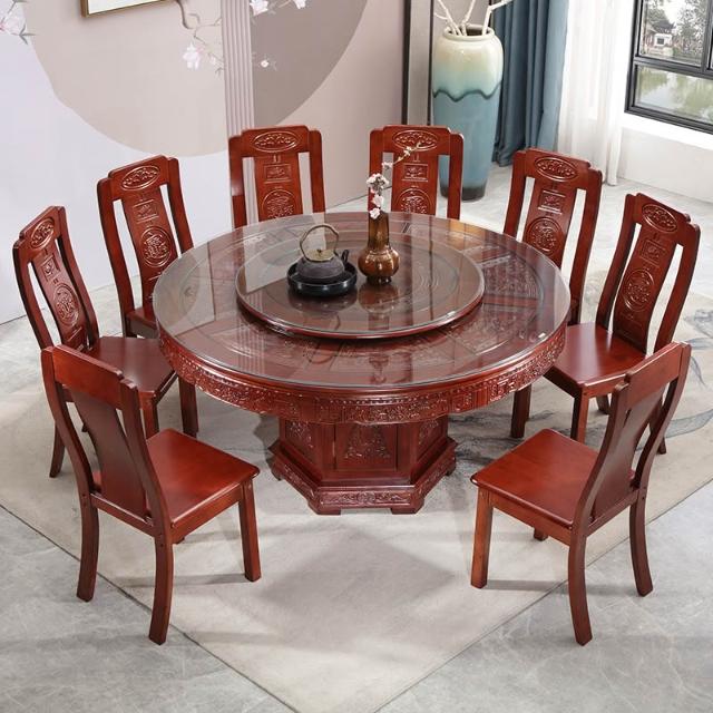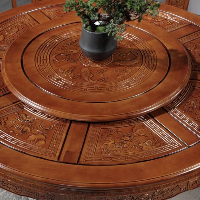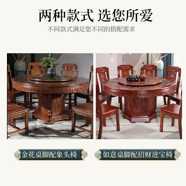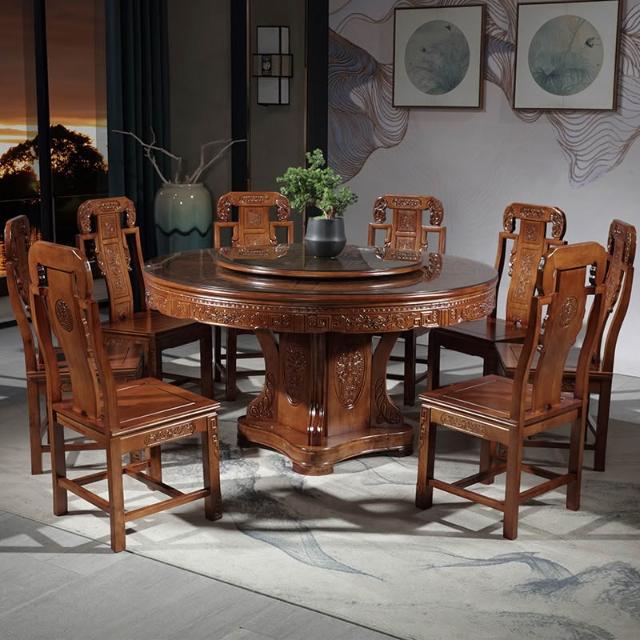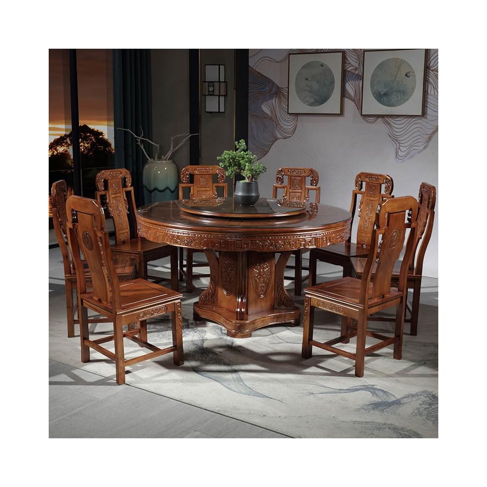 中式全實木圓形餐桌椅組合家用帶轉盤大圓桌酒店10人橡木雕花飯桌