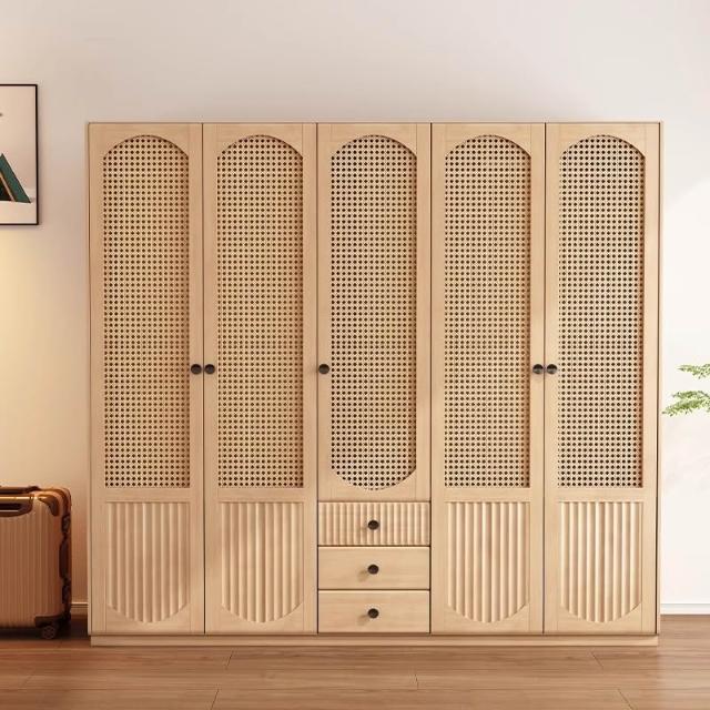 日式全實木藤編衣櫃家用臥室櫻桃木色木質北歐原木復古風藤編衣櫃