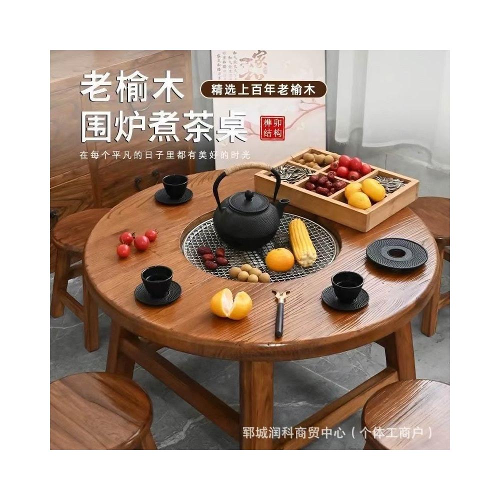 老榆木高檔圍爐煮茶冰茶全套實木茶桌組合圓形煮茶火鍋桌陽臺家用