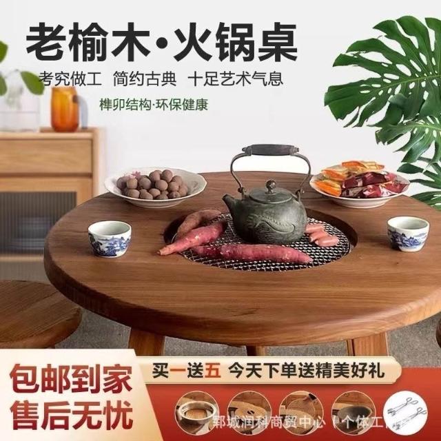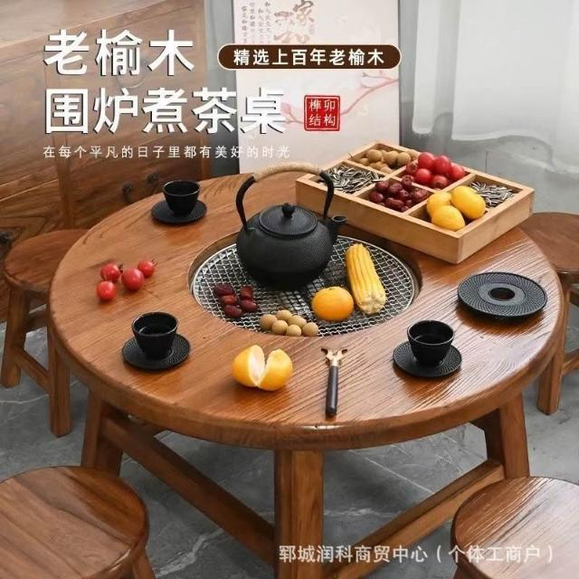 老榆木高檔圍爐煮茶冰茶全套實木茶桌組合圓形煮茶火鍋桌陽臺家用
