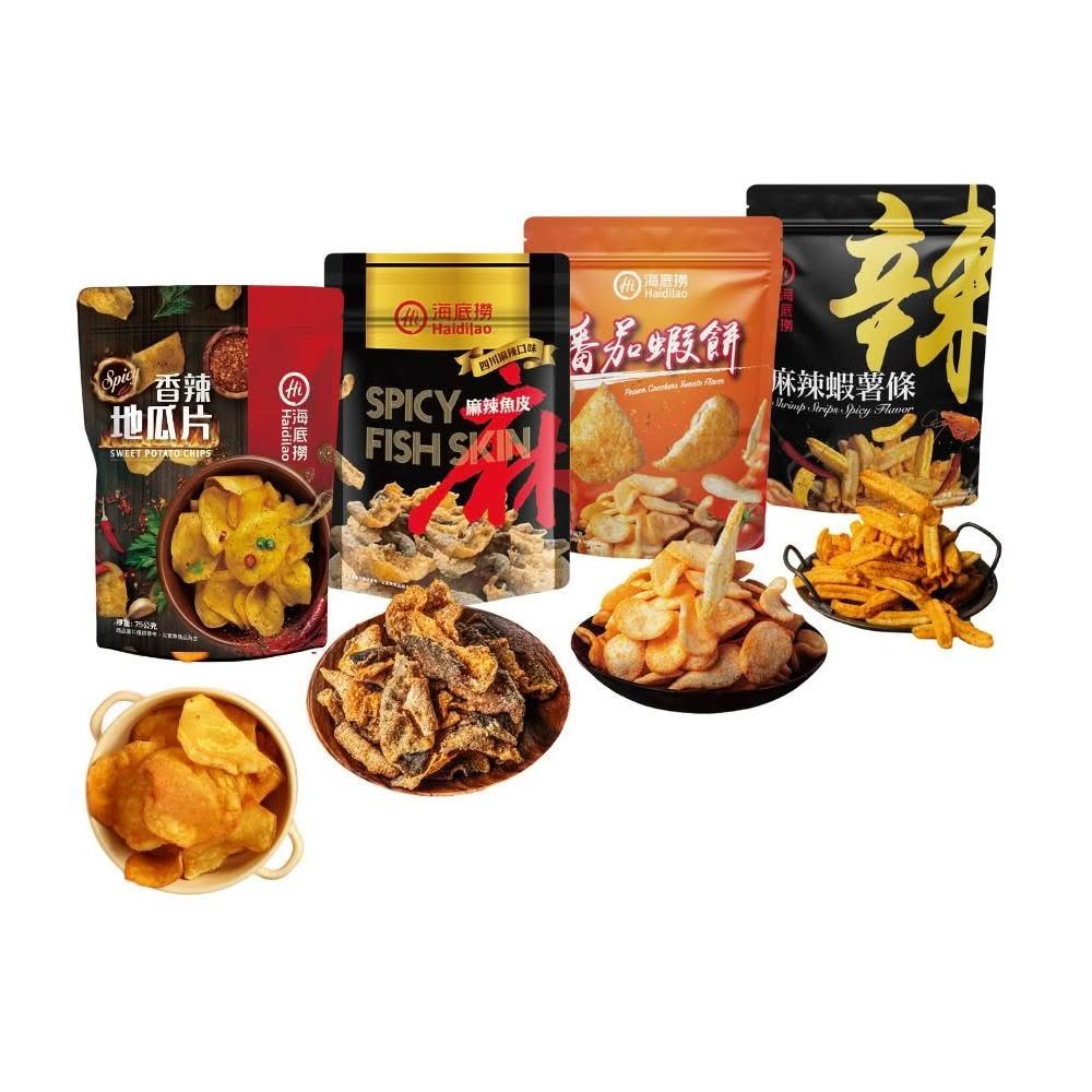 海底撈香辣地瓜片/麻辣魚皮/番茄蝦餅/麻辣蝦薯條