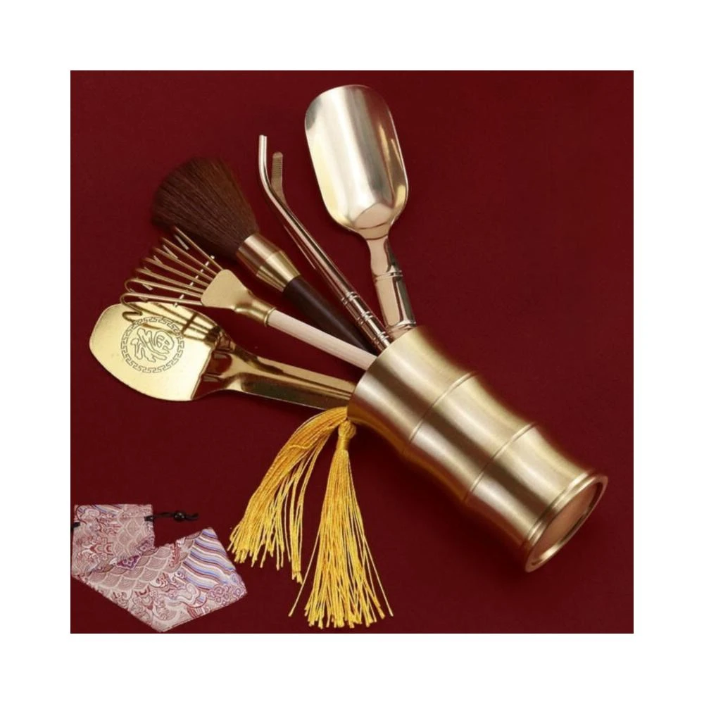香爐香灰清理工具套裝 黃銅 (竹節瓶 耙子 平灰鏟 夾子 佛塵掃)