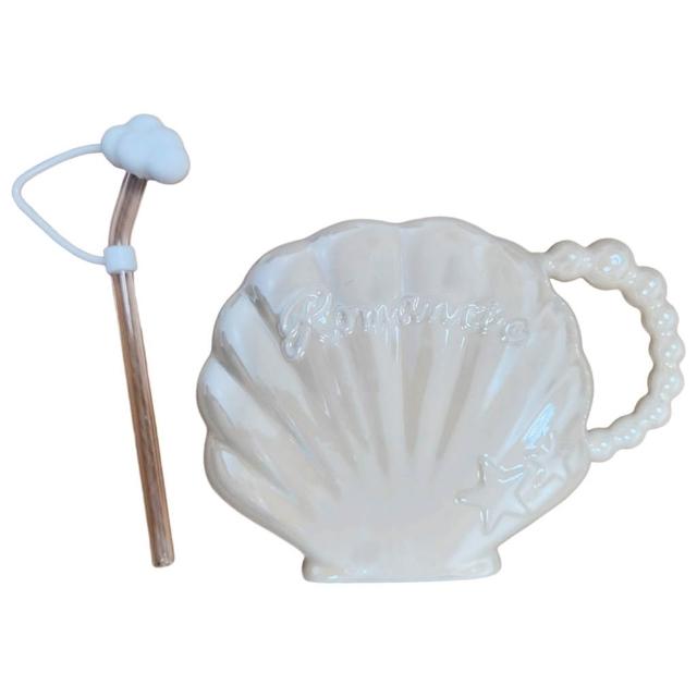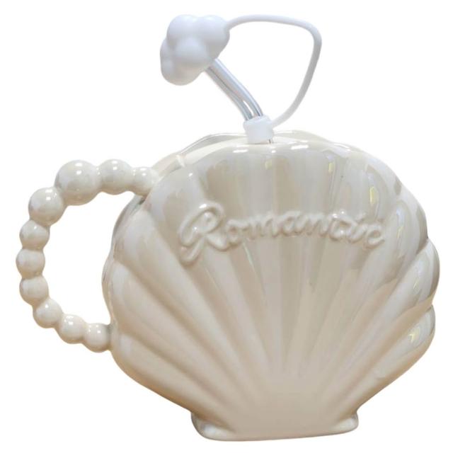 花蓮遠雄海洋公園貝殼陶瓷杯 450ML 貝殼造型 附吸管 珍珠白