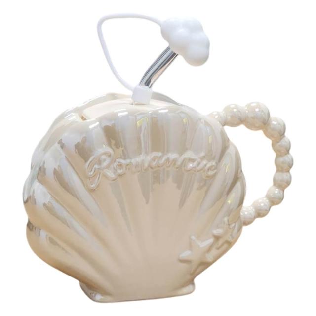 花蓮遠雄海洋公園貝殼陶瓷杯 450ML 貝殼造型 附吸管 珍珠白