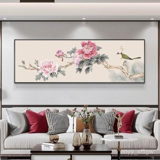 花開富貴牡丹圖新中式客廳沙髮背景墻 橫款裝飾畵 臥室掛畵 餐廳壁畵 背景牆裝飾 牡丹花掛畫 餐廳掛畫