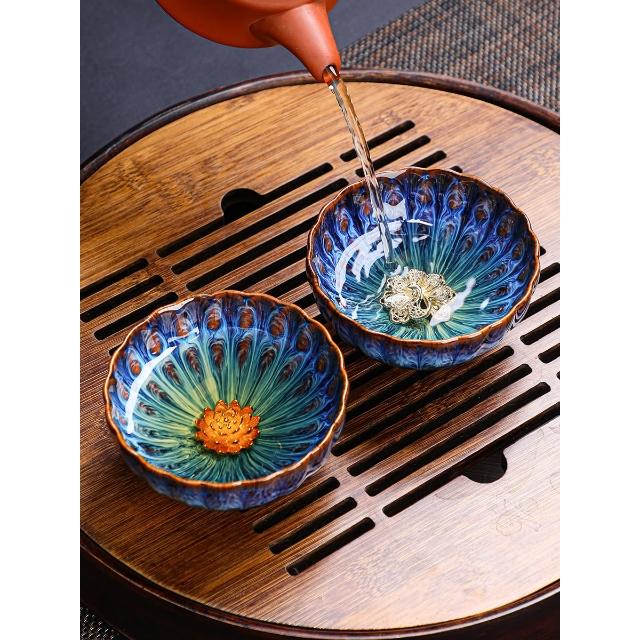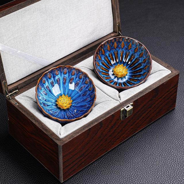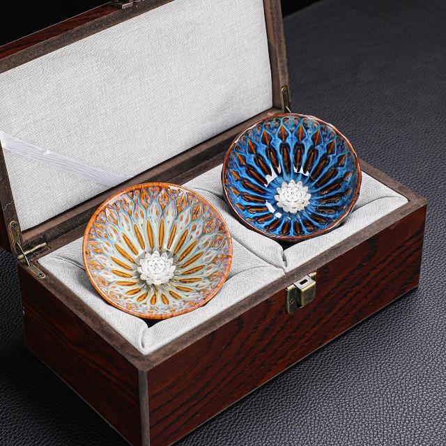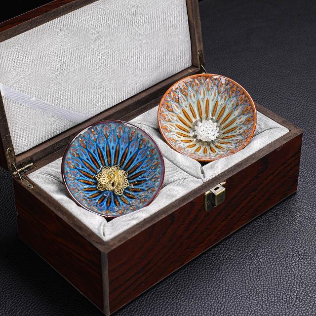 嵐宮窯敦煌蓮花盞孔雀建盞主人杯對杯茶杯一對茶盞陶瓷禮盒裝高檔