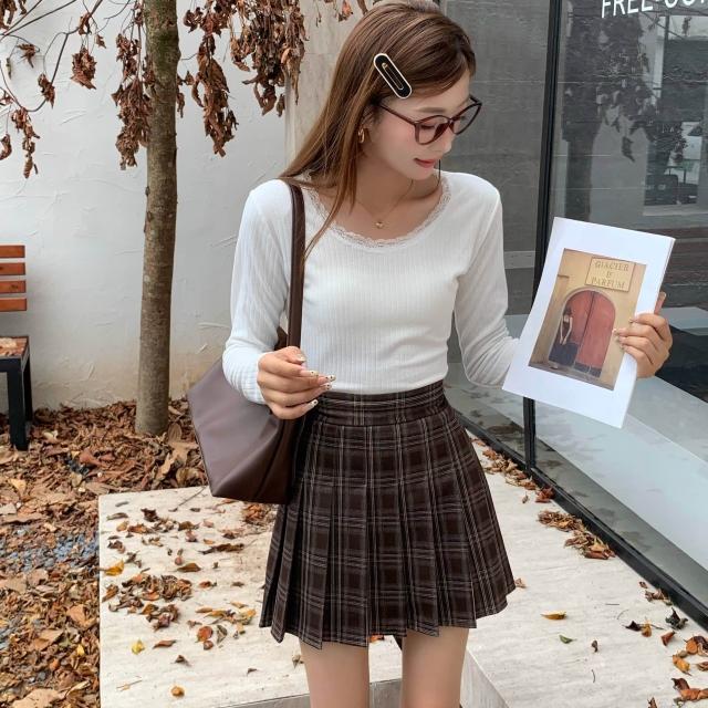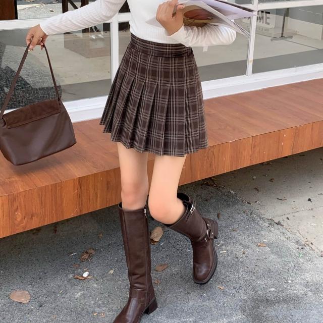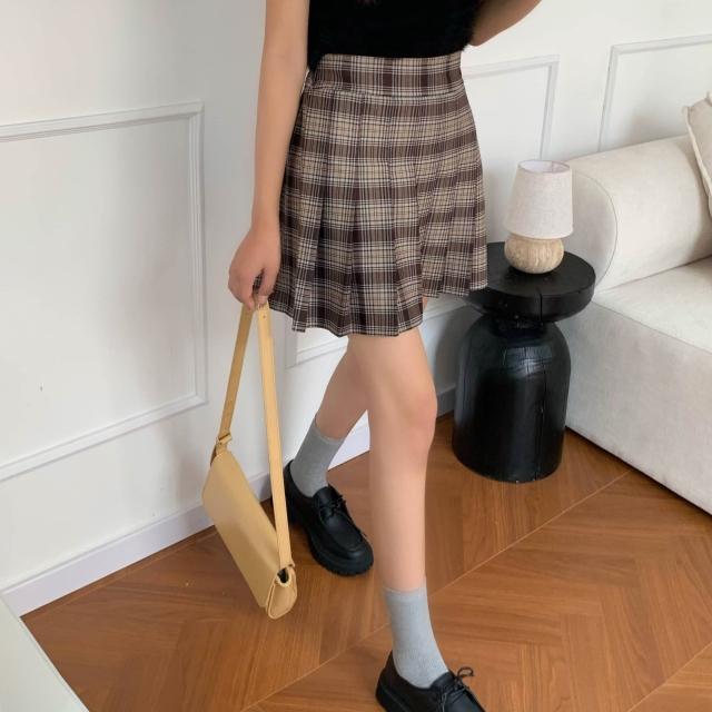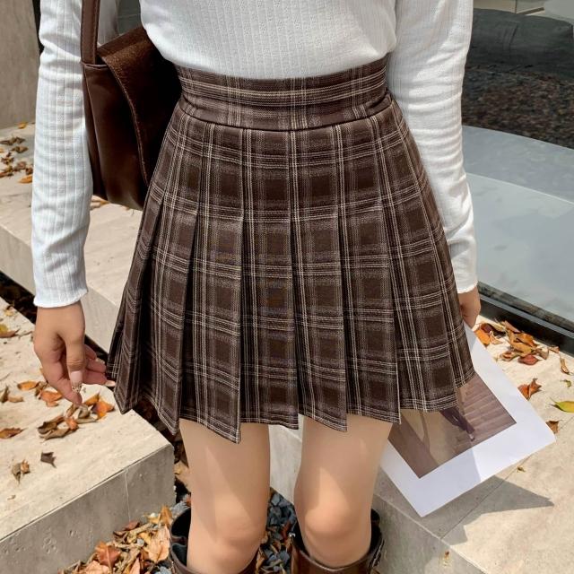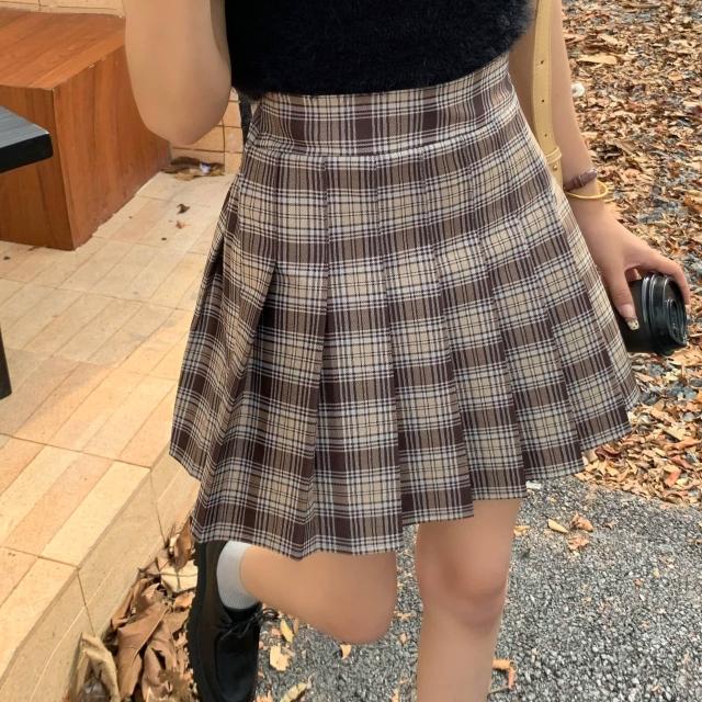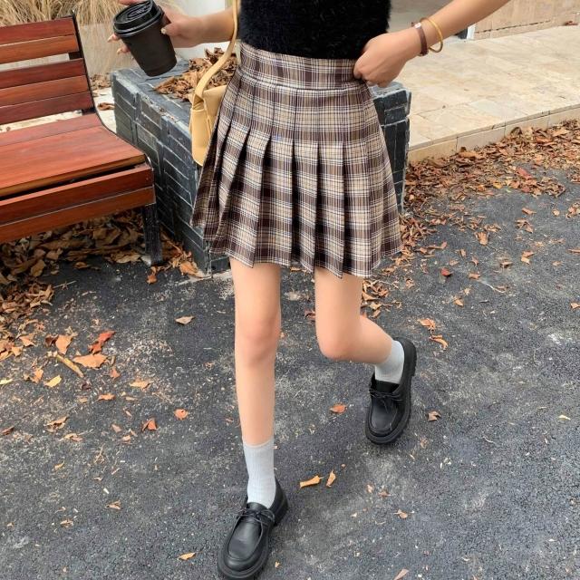復古學院風棕色格子百褶裙 高腰A字顯瘦短裙 時尚百搭半身裙