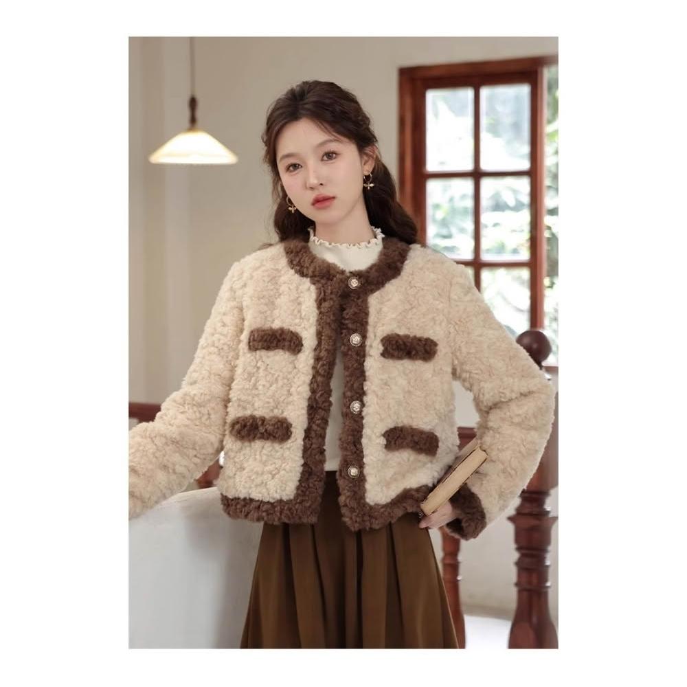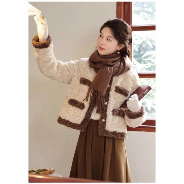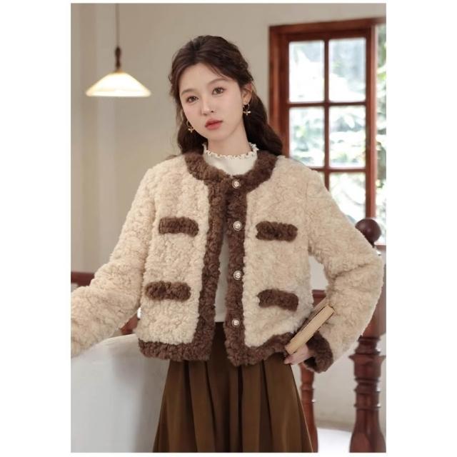 小香風短版外套 撞色滾邊毛絨上衣 氣質珍珠釦 長袖保暖外套 女款時尚穿搭