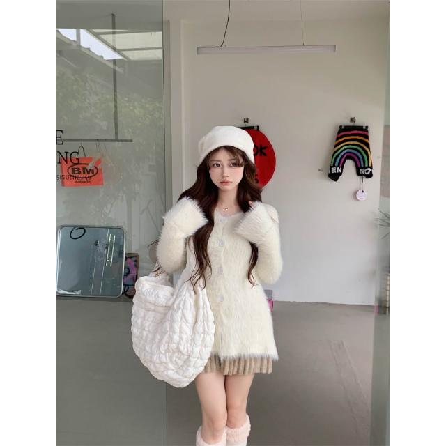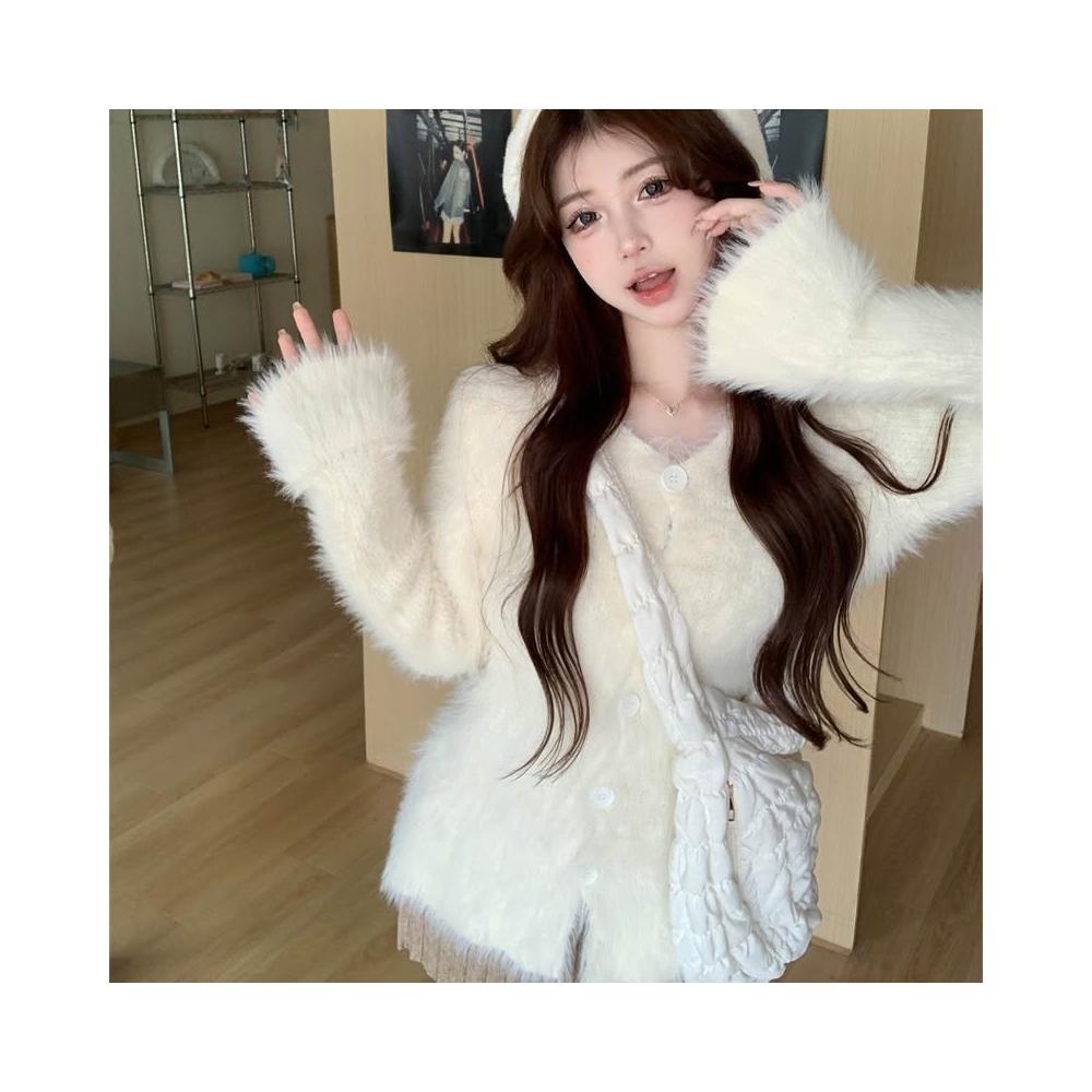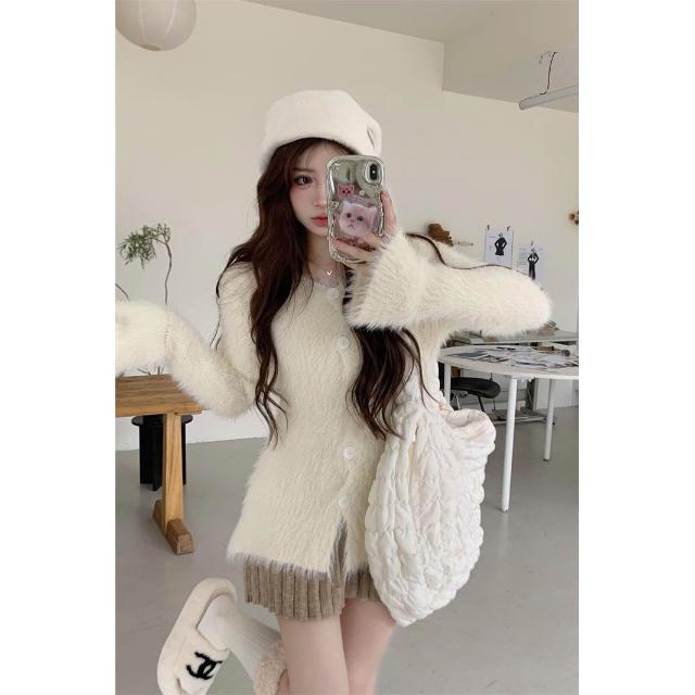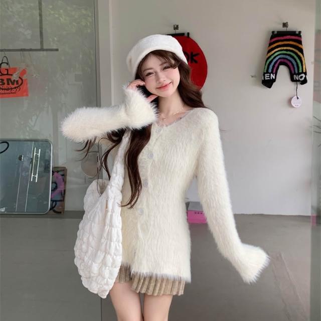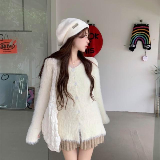 溫柔風奶杏色仿貂毛長袖針織外套 氣質V領設計感毛衣 甜美修身顯瘦上衣