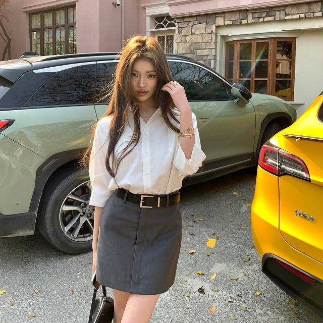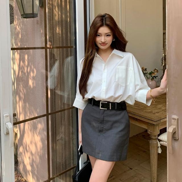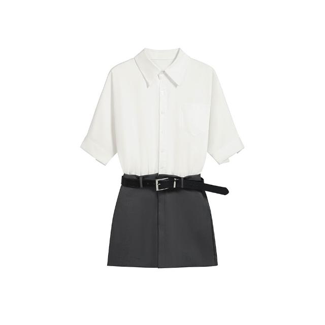 知性風白色襯衫裙套裝 短袖收腰顯瘦A字短裙