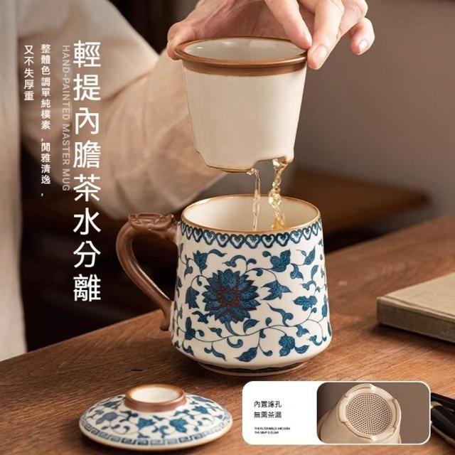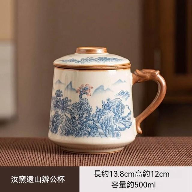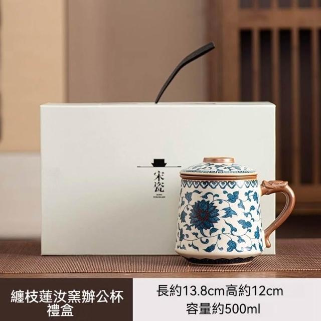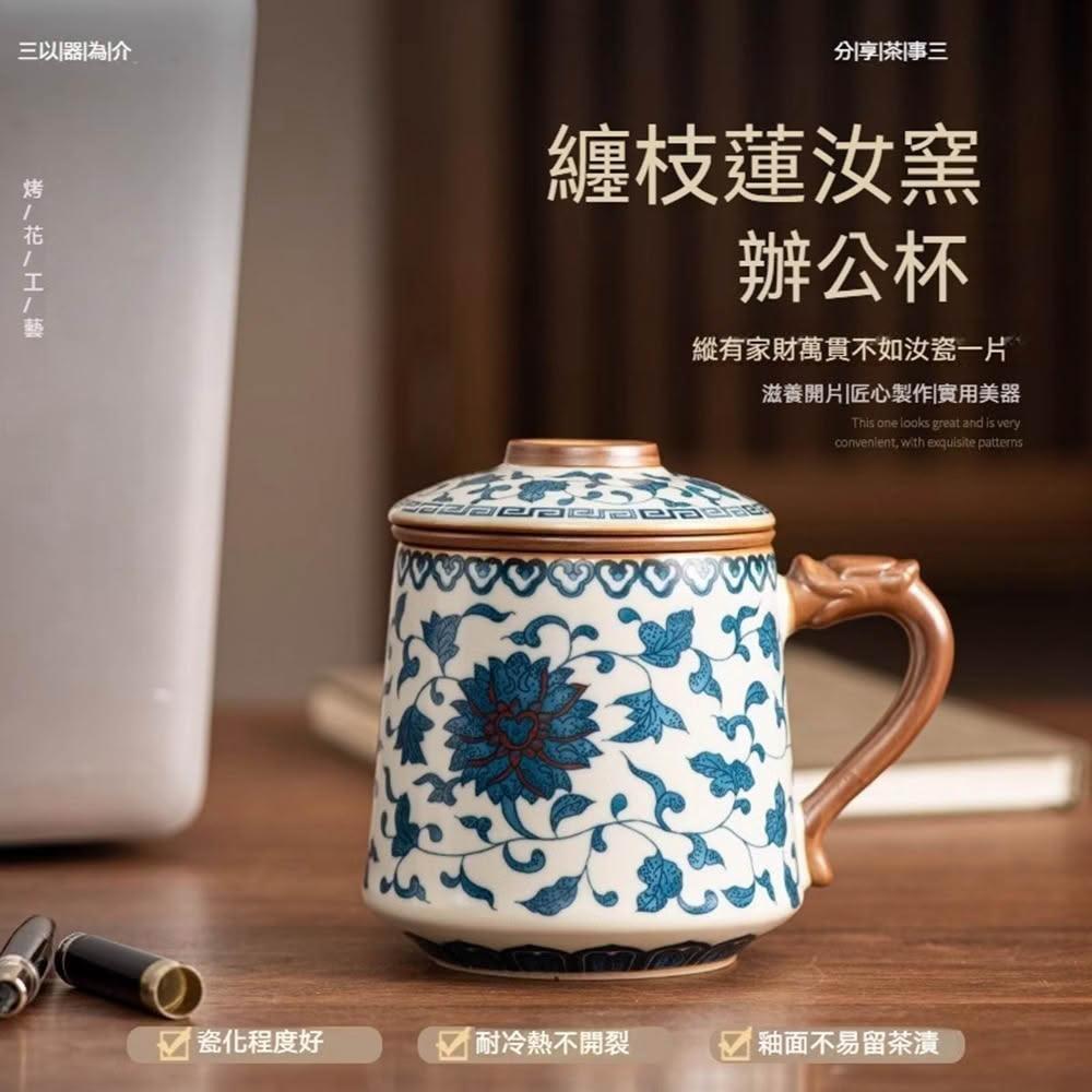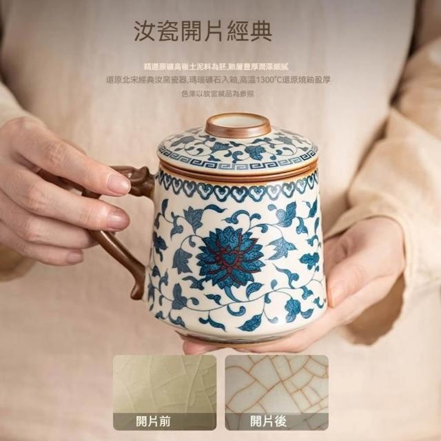 Jimi 集米 汝窯開片纏枝蓮辦公杯 過濾馬克杯 陶瓷帶蓋茶杯 茶水分離泡茶杯 水杯 禮盒