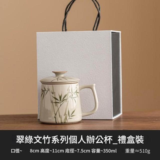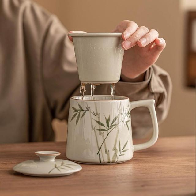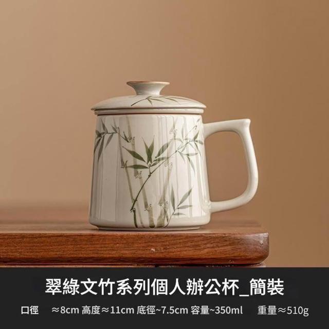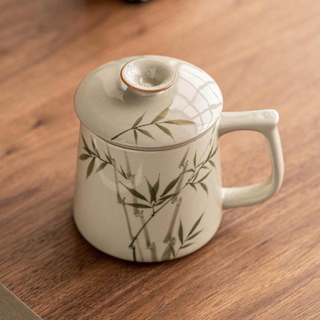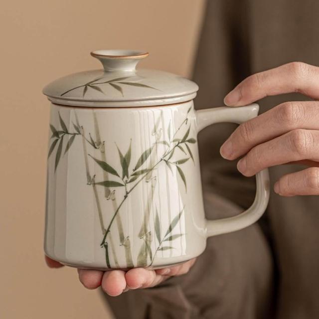 Jimi 集米 手繪翠綠文竹茶杯 陶瓷泡茶杯 帶蓋馬克杯 茶水分離辦公杯 高檔喝茶杯個人杯