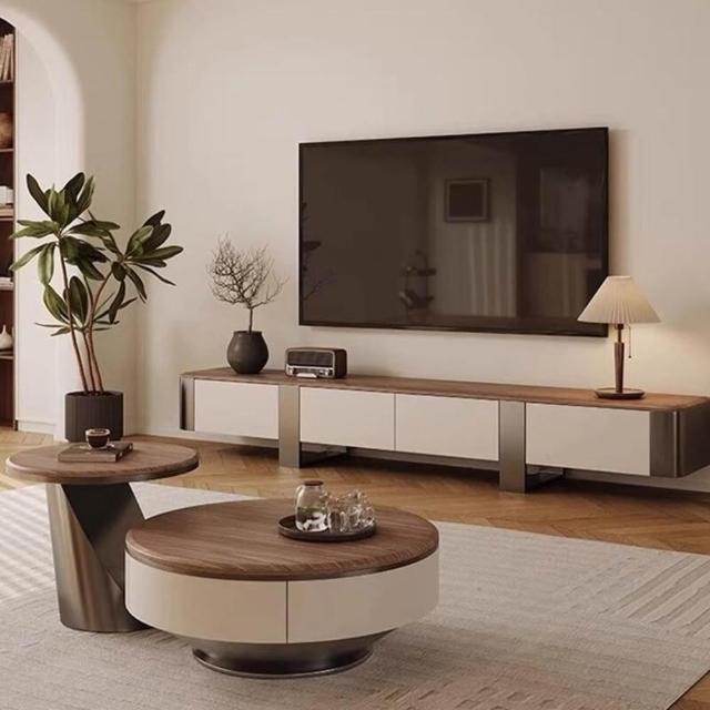 實木圓形茶几 小戶型客廳家用高端茶台带抽屜 茶几電視櫃組合 客廳茶几