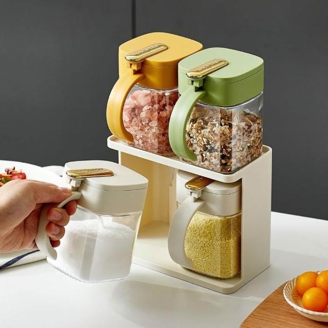 可單手開蓋 玻璃調味罐 奶呼色家居 送調味勺 調味瓶 調味料罐 調味料收納 收納盒 廚房收納盒 壁掛收納盒