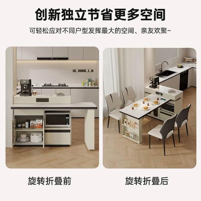 簡約岩板島台餐桌一體小戶型多功能新款旋轉中島家用實木伸縮吧檯