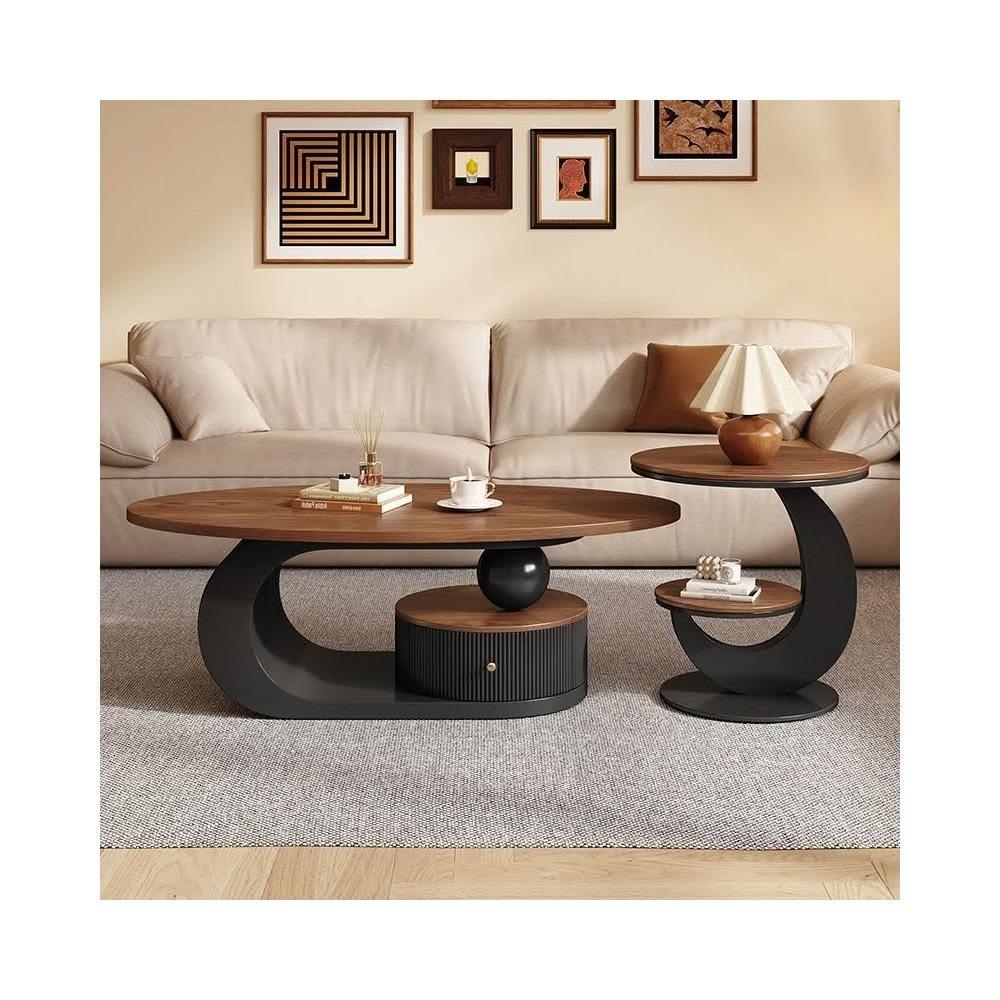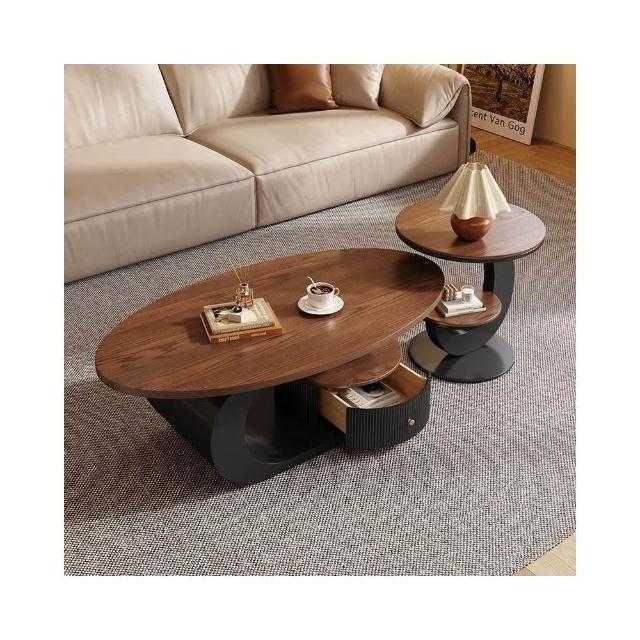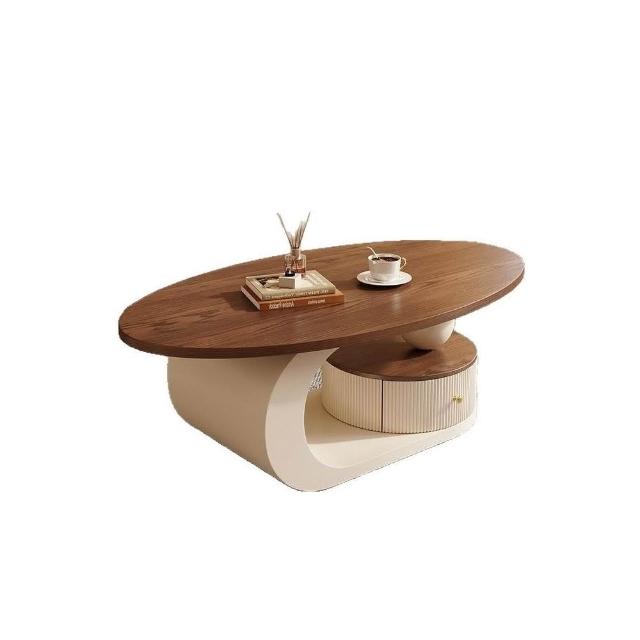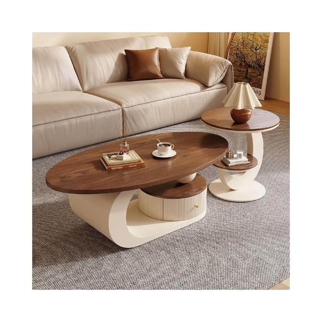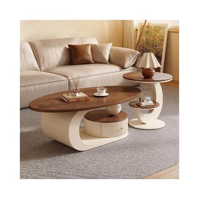 侘寂風奶油橢圓形茶几胡桃木色小戶型家用客廳茶桌組合輕奢感