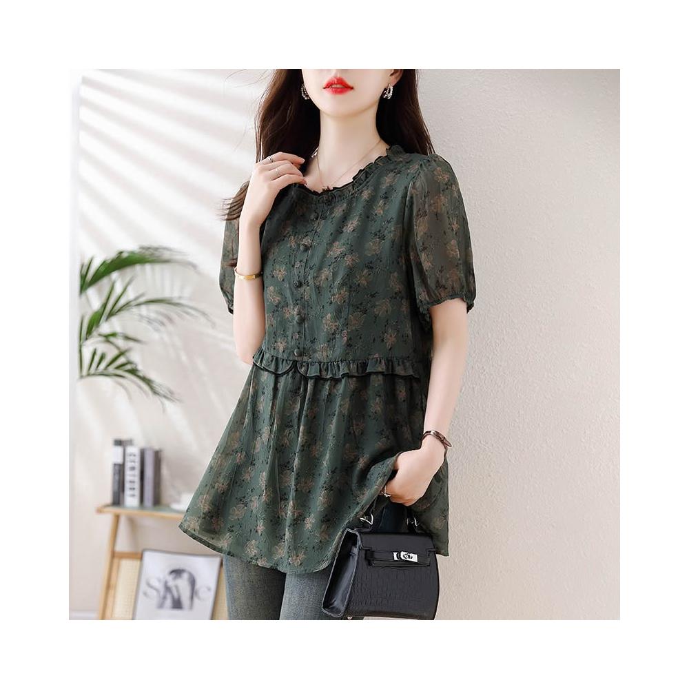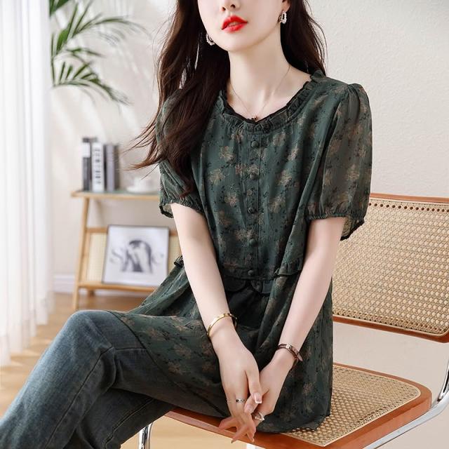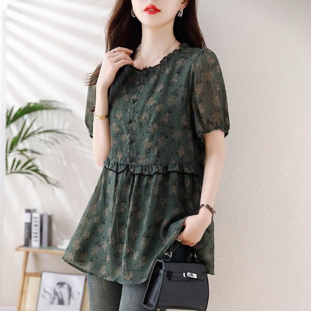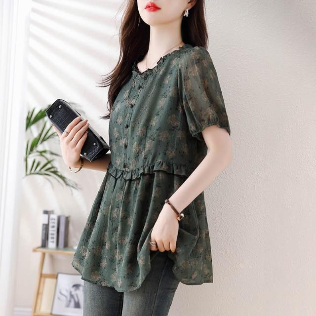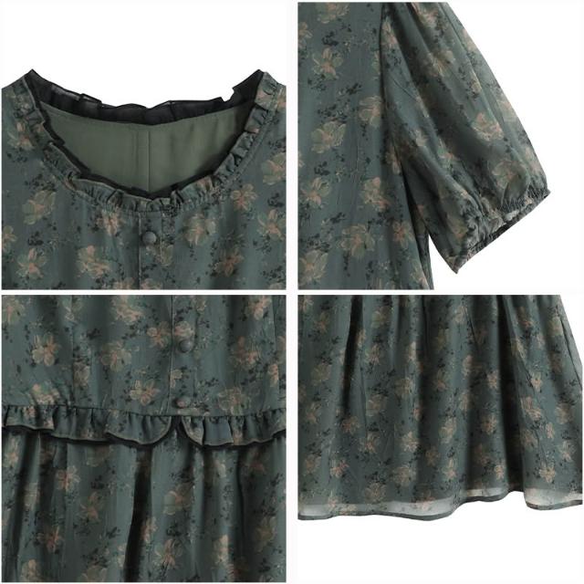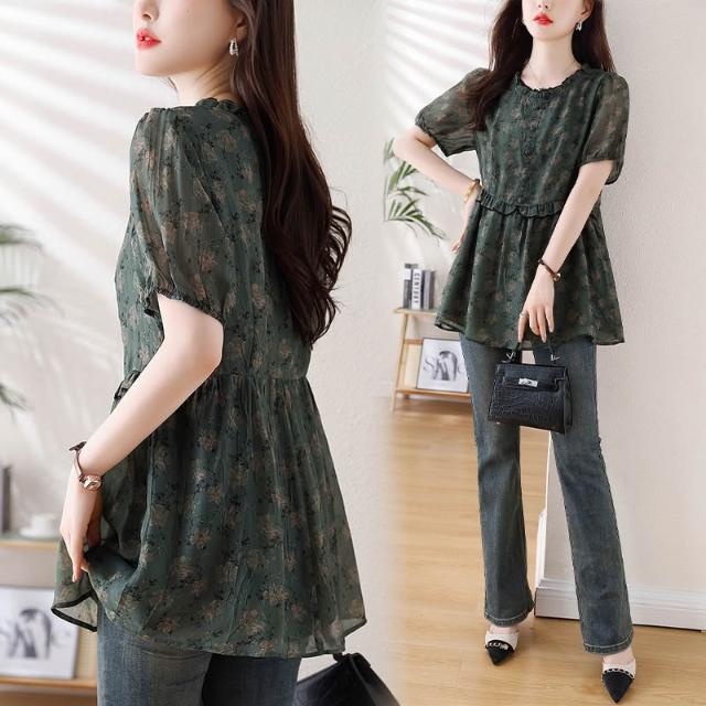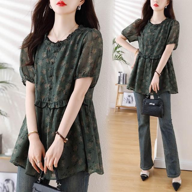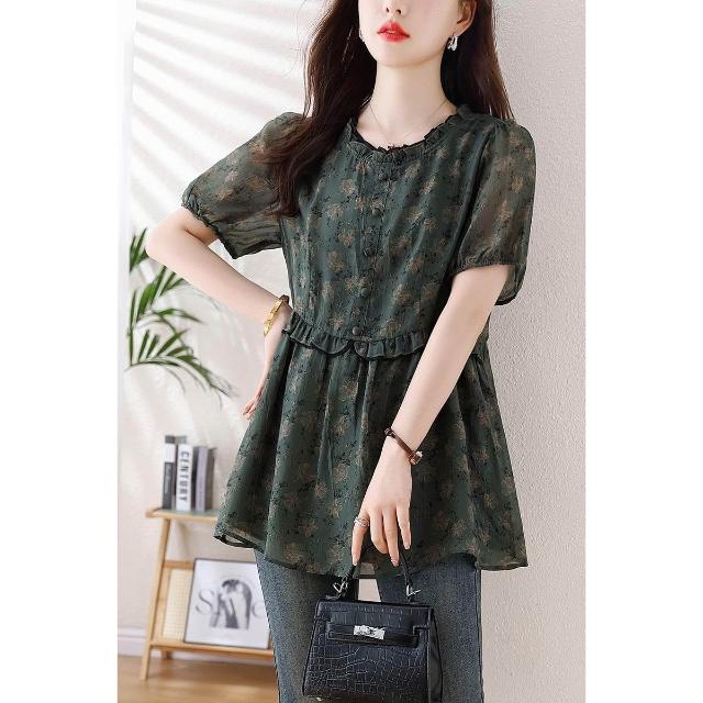 春夏短袖 T恤 上衣 2026年新款大碼女裝胖mm雪紡碎花T恤上衣 寬松遮肉顯瘦短袖襯衫女 百信百貨