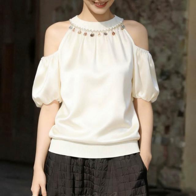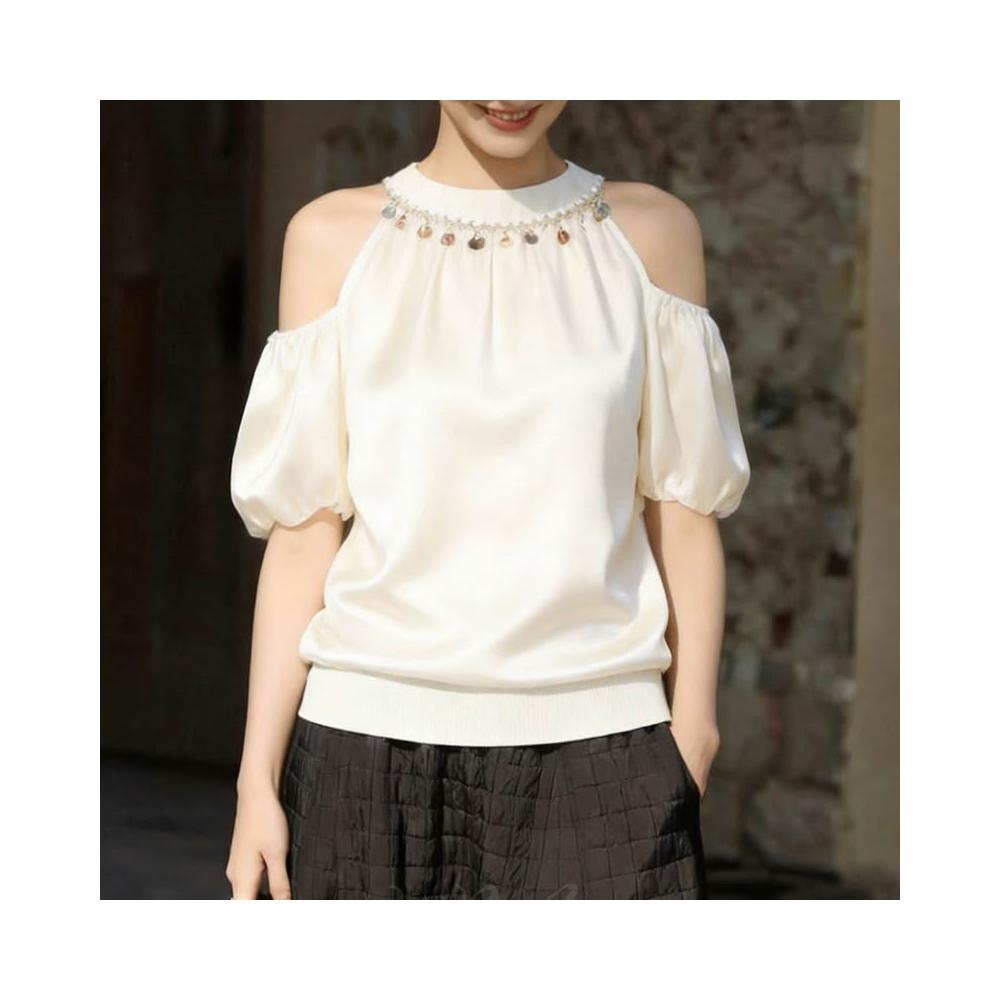 春夏短袖 T恤 上衣 法式設計感氣質短袖襯衫女夏季新款露肩襯衣減齡洋氣白色上衣 百信百貨
