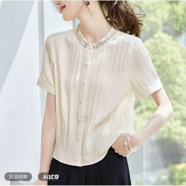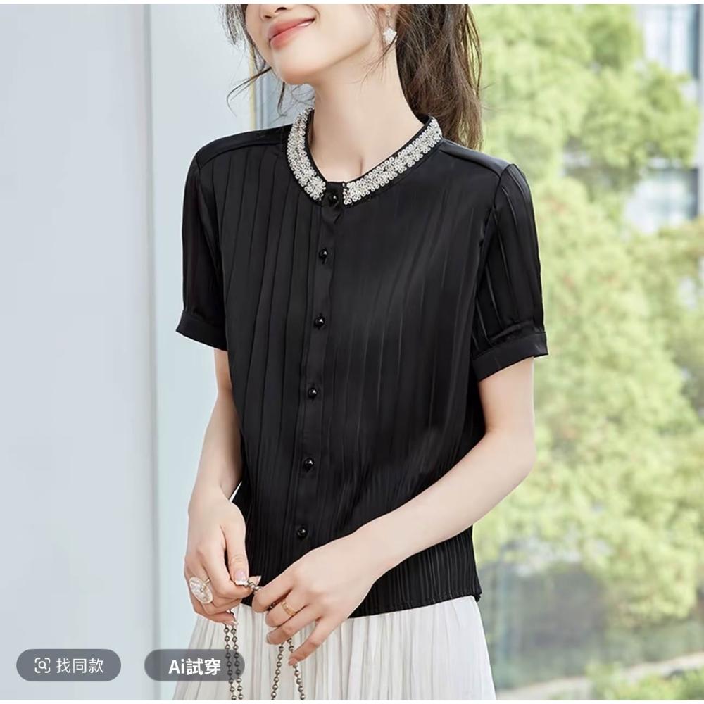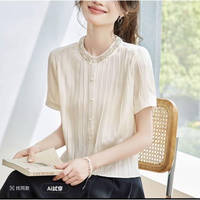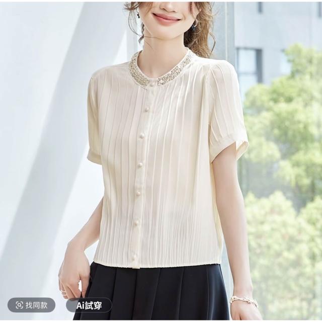 春夏短袖 T恤 上衣 2026新款韓系夏季法式立領釘珠短袖襯衫女高級感顯瘦百搭氣質上衣 百信百貨