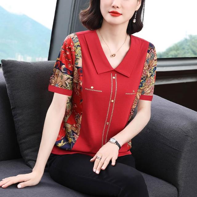 春夏短袖 T恤 上衣 新款女士媽媽裝2026年春季短袖V領寬松氣質上衣燙鉆撞色印花洋氣T 百信百貨