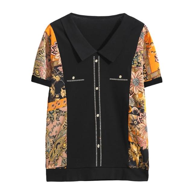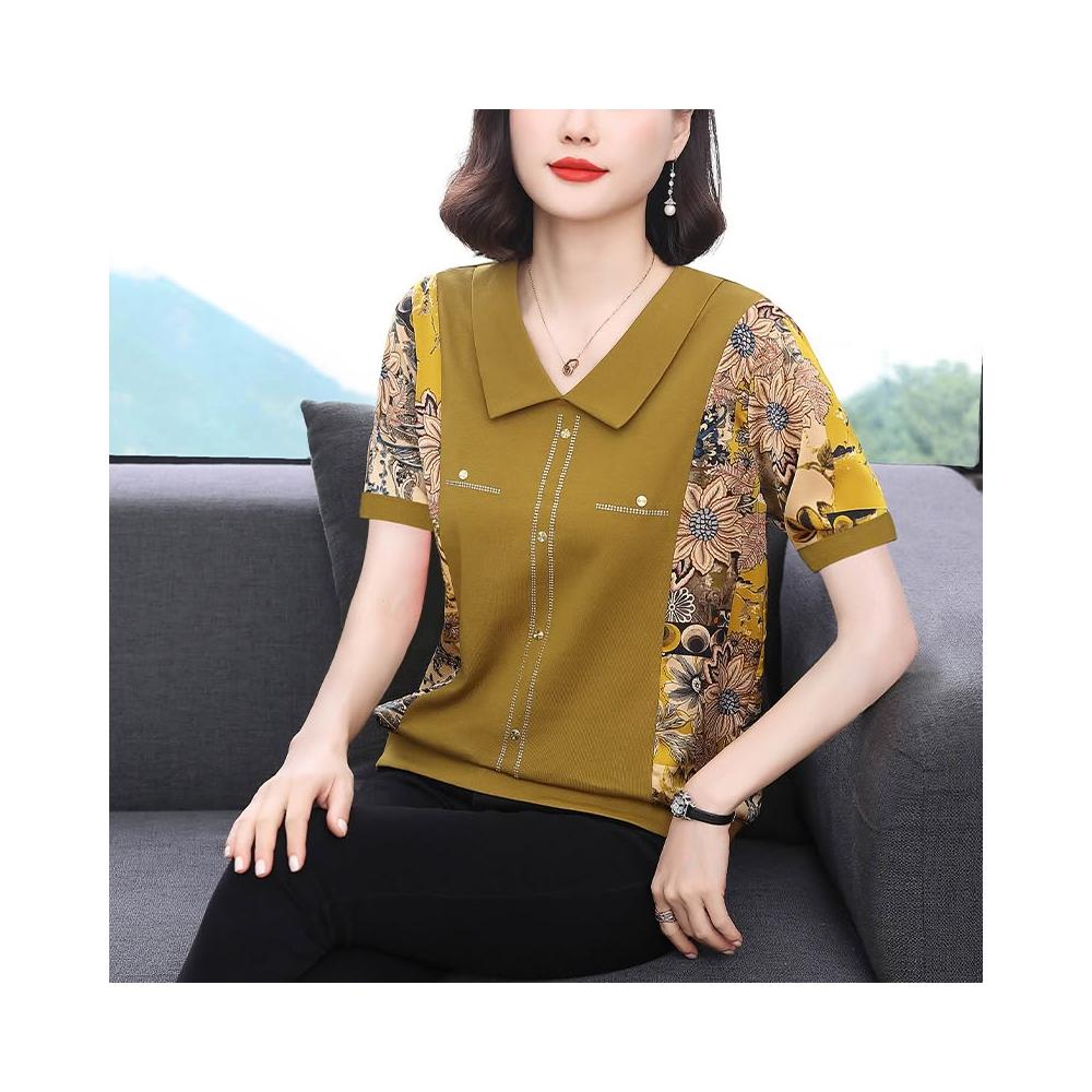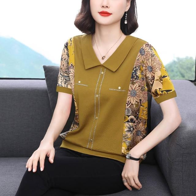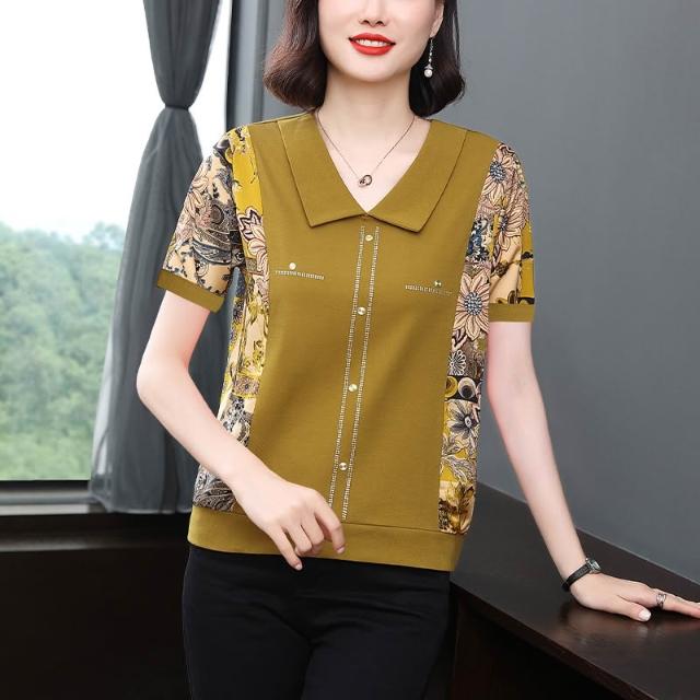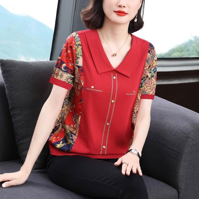 春夏短袖 T恤 上衣 新款女士媽媽裝2026年春季短袖V領寬松氣質上衣燙鉆撞色印花洋氣T 百信百貨