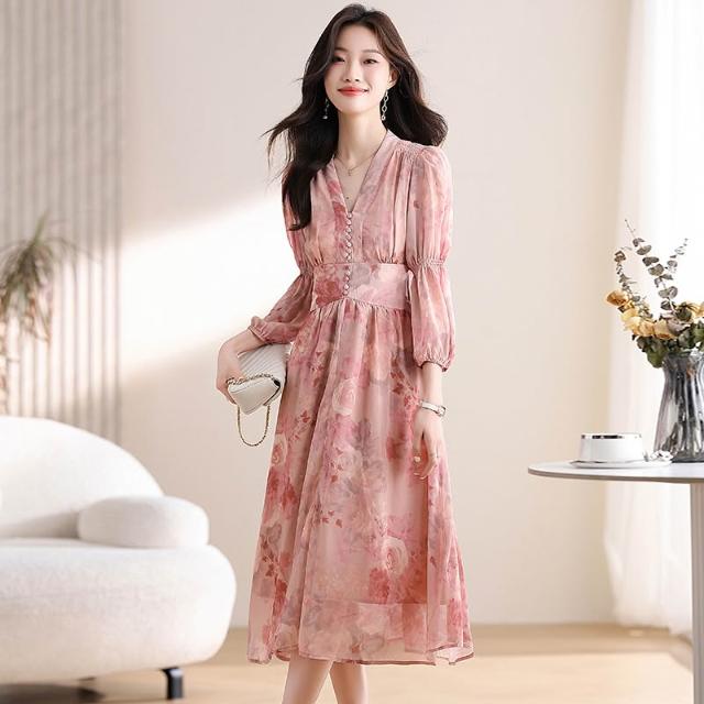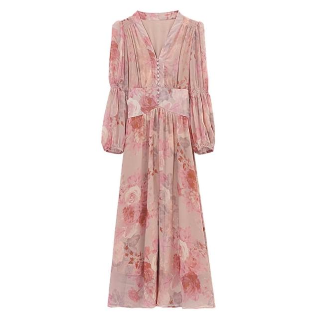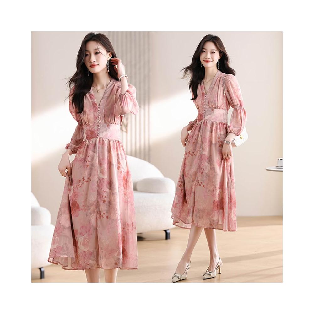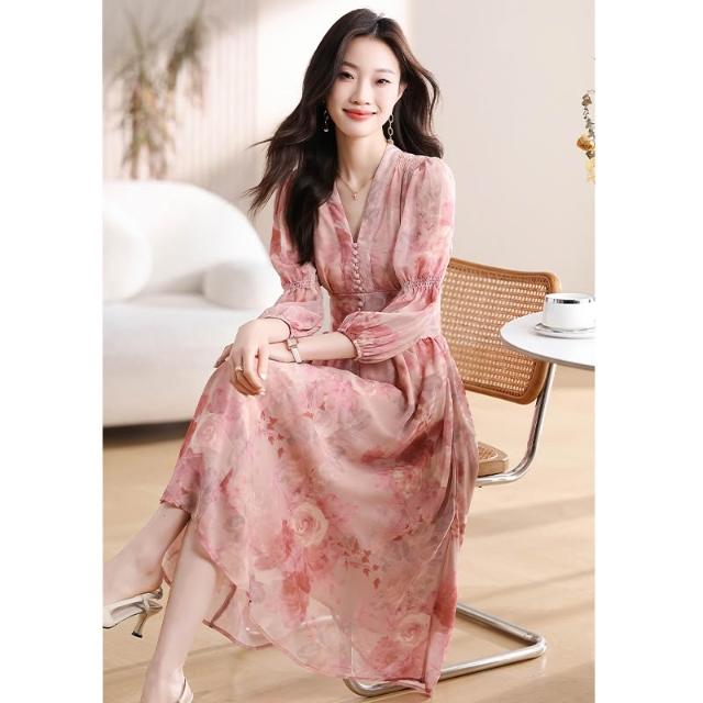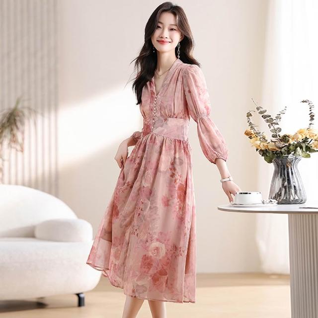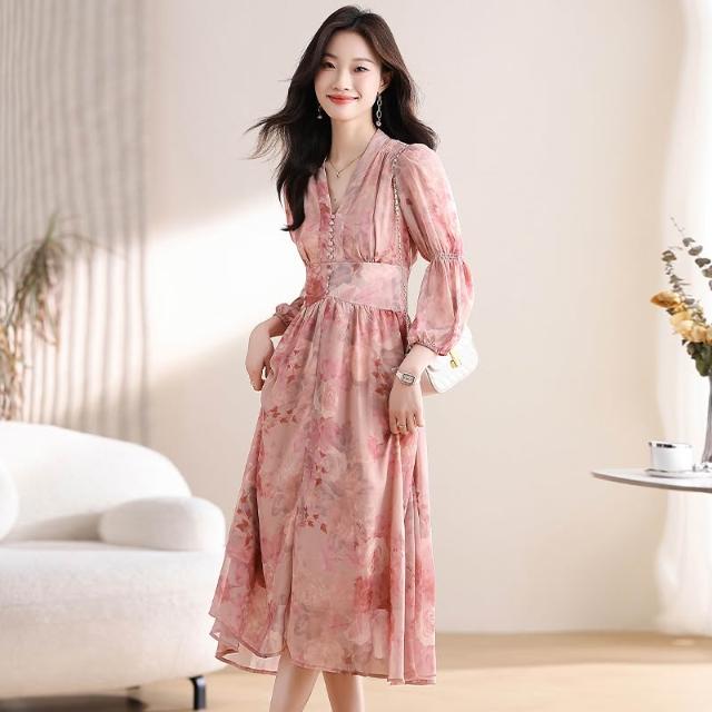 新款連衣裙 百搭洋氣 透氣輕薄 實拍優雅女人味茶歇裙溫柔風收腰顯瘦燈籠袖粉色碎花連衣裙女春 百信百貨