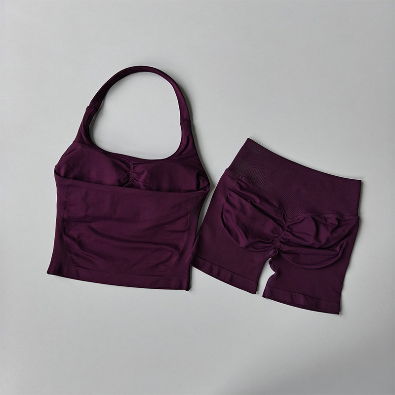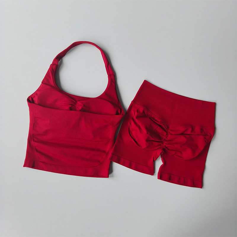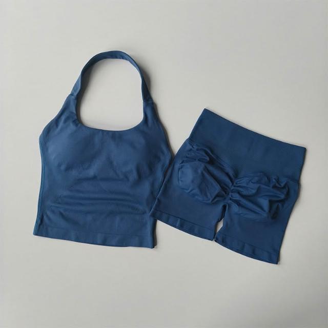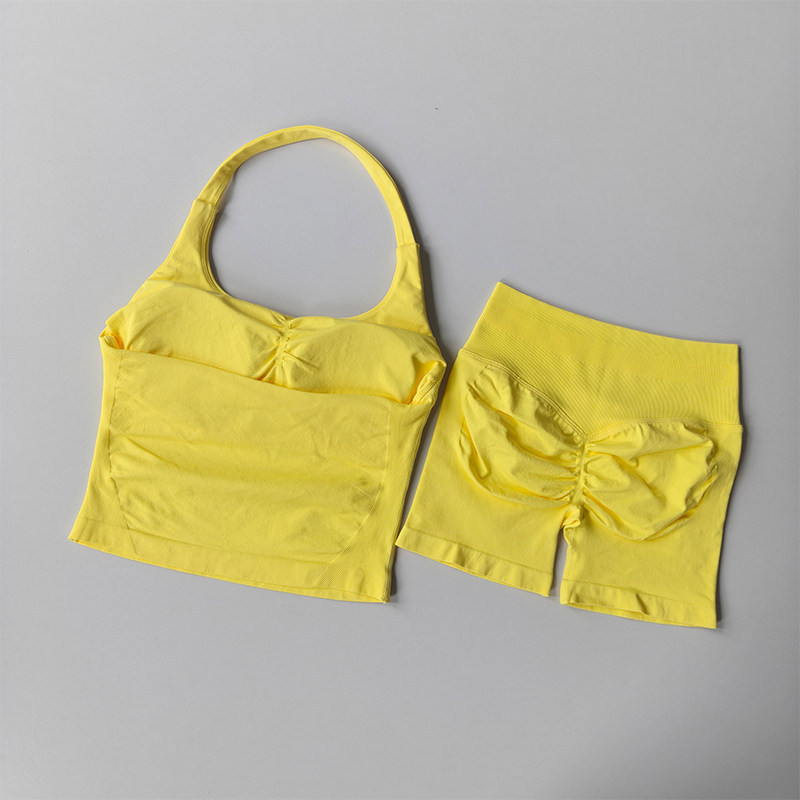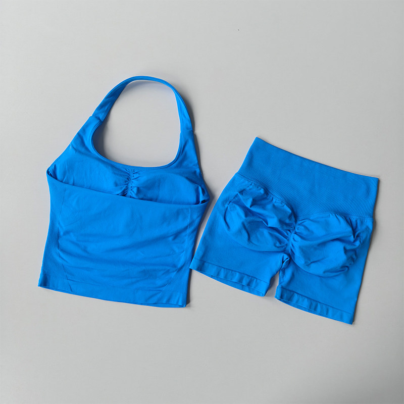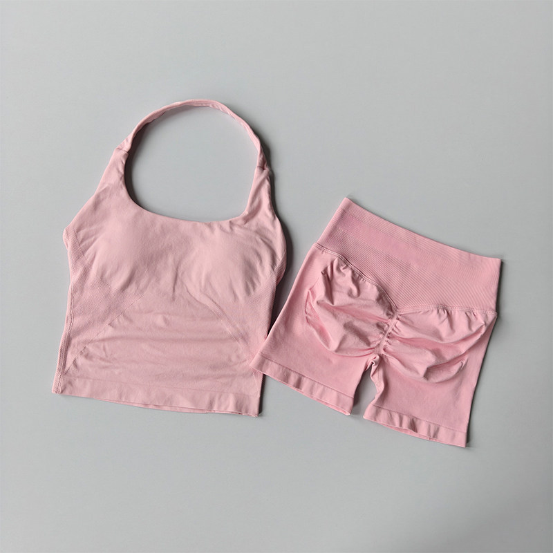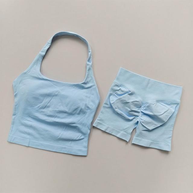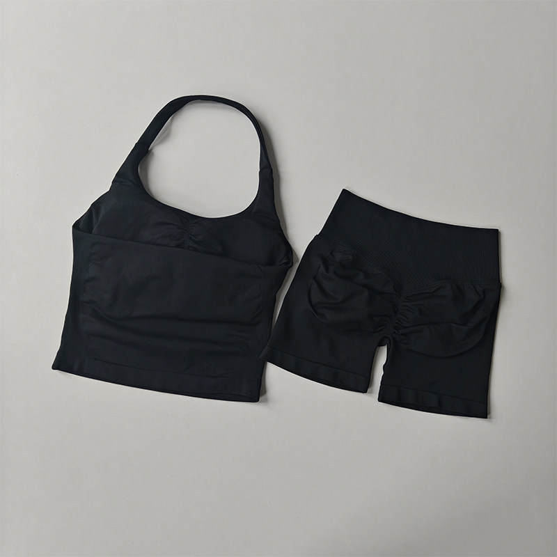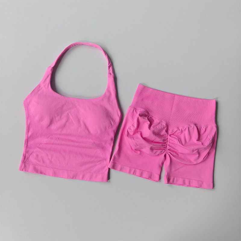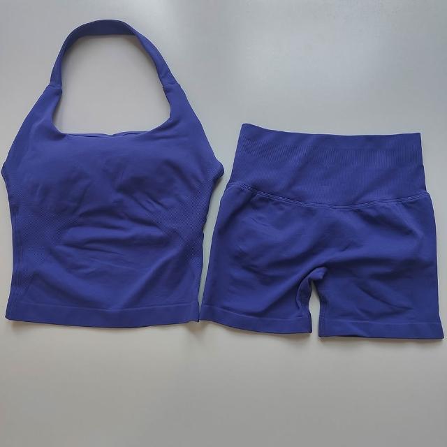 新款套裝 運動套裝 瑜伽服 跨境dfyne無縫瑜伽套裝女瑜伽短褲蜜桃提臀掛脖運動背心健身套裝 百信百貨