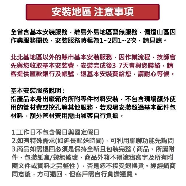 - 針對大型商品(包括:大型家電、家具床墊、健身按摩器材、車類...等),商店將於完成收款確認後,一天內〈不含例假日〉將會有專人與您確認相關配送細節等的聯繫。偏遠地區、樓層費及其它加價費用,皆由商店於約定配送時一併告知,商店將保留出貨與否的權利。