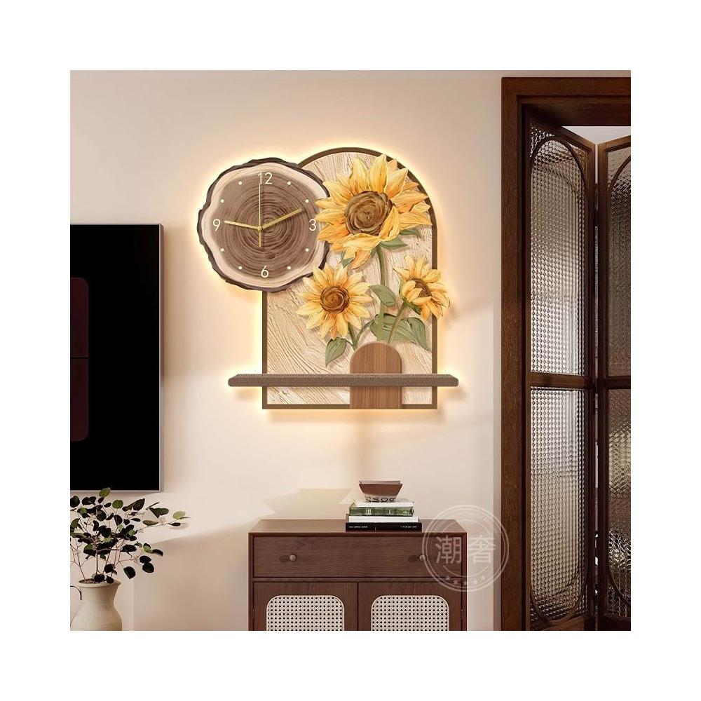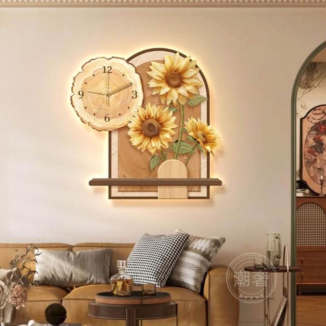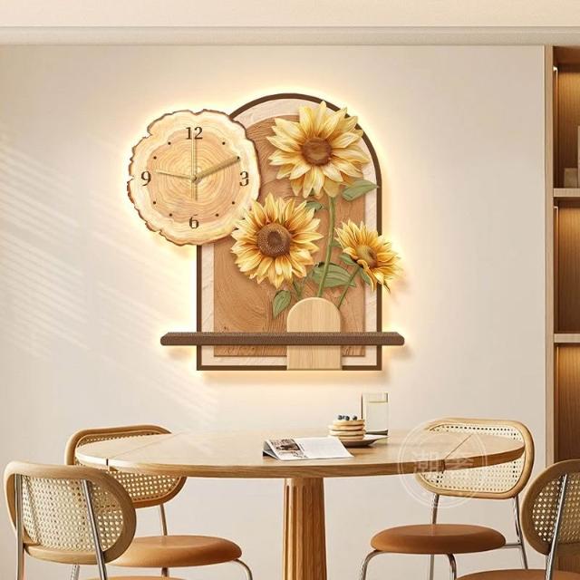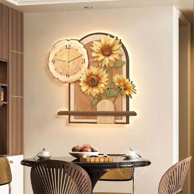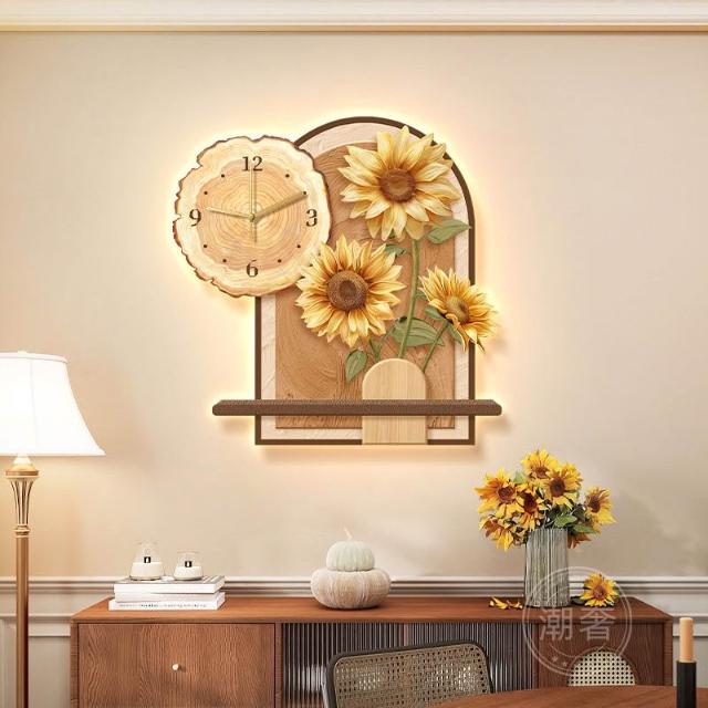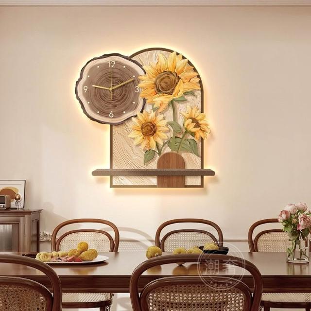 中古風餐廳裝飾畫向日葵鐘錶客廳掛鐘奶油風電視背景牆壁掛畫時鐘