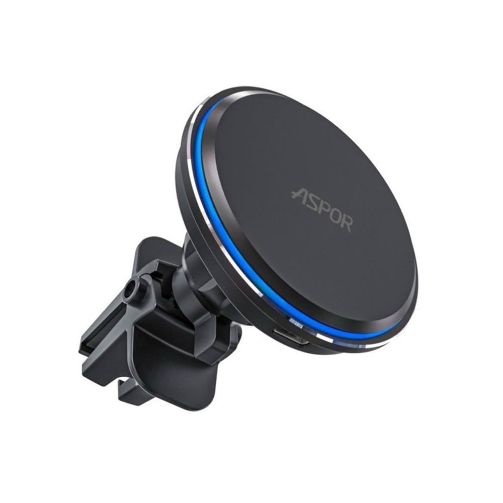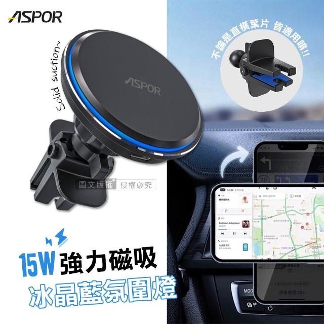 ASPOR 15W磁吸無線快充 冰晶藍氛圍燈 360度強力磁吸 車用出風口充電座 手機架