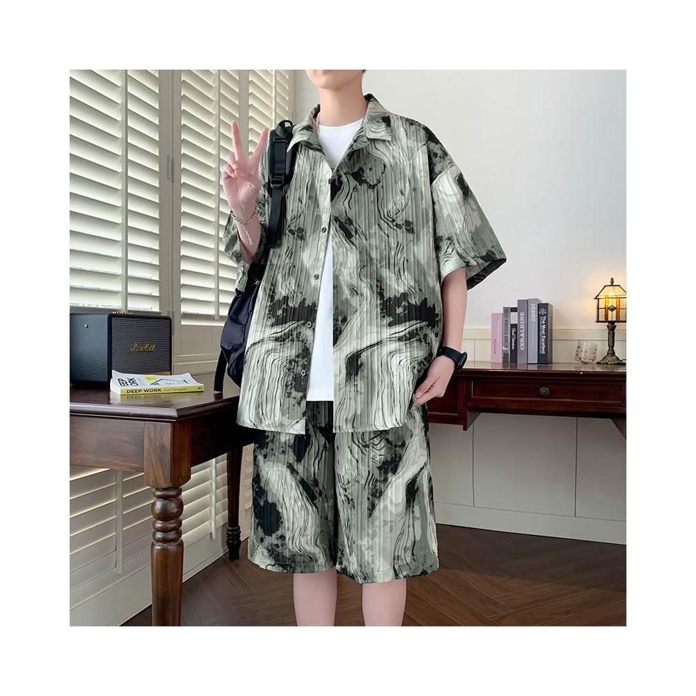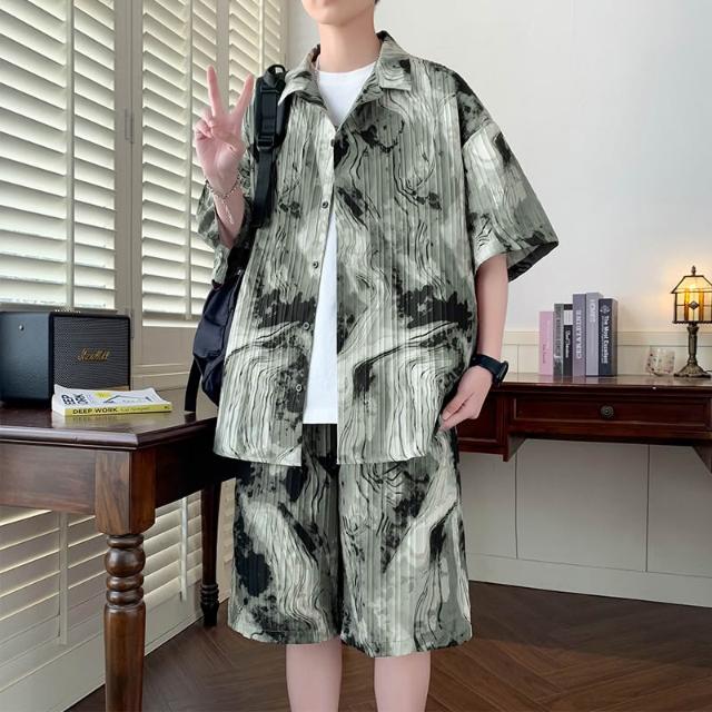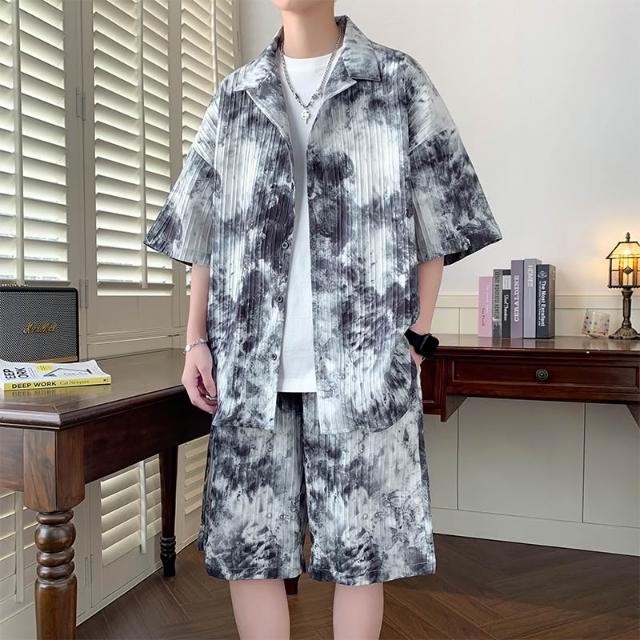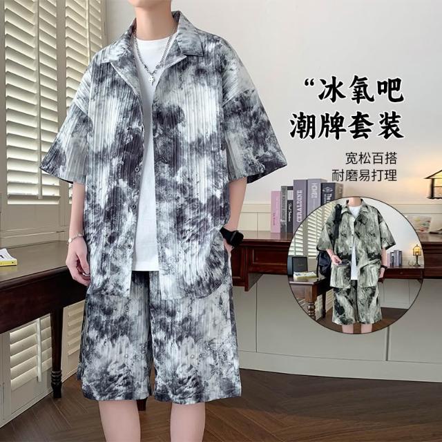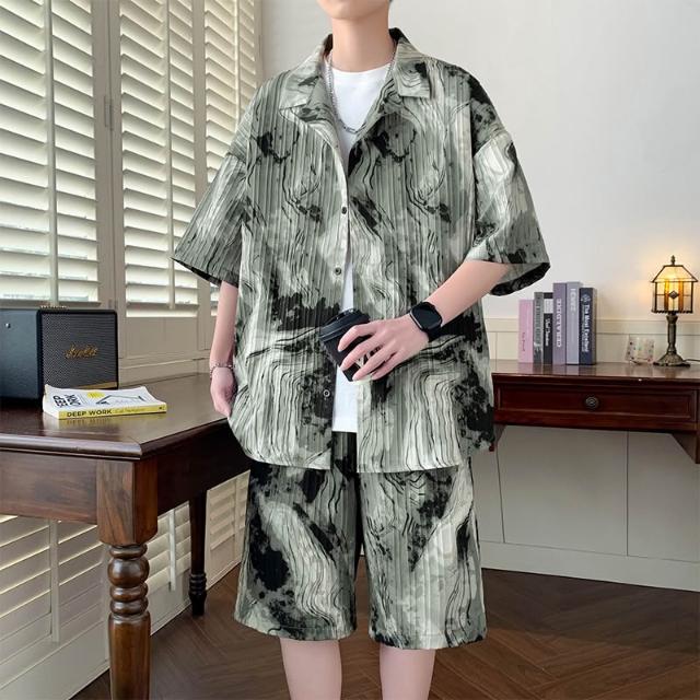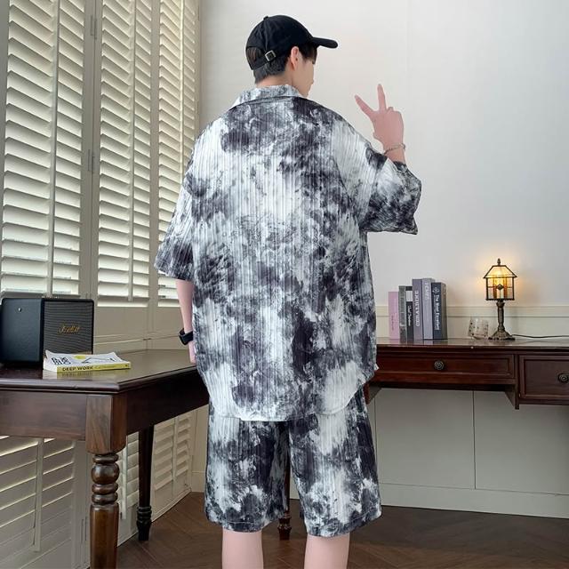 夏季冰絲扎染翻領上衣 潮流涼感襯衫T恤 冰絲涼感套裝 襯衫上衣 速乾短褲 半袖透氣襯衫男 沙灘套裝男 排汗短褲男 短褲男