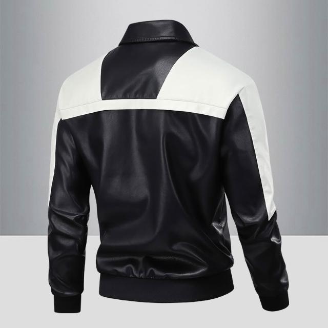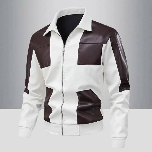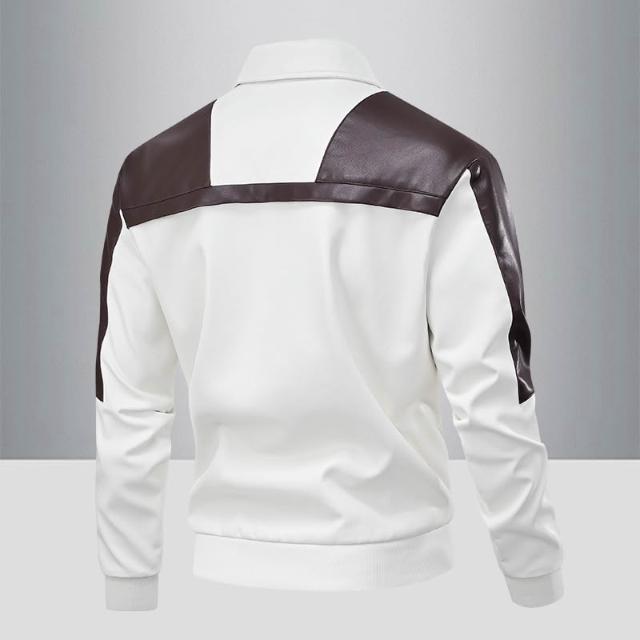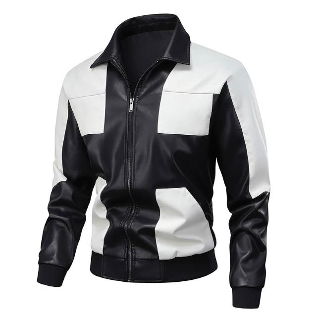 美式撞色拼接機車服春秋季新款男士騎行賽車服翻領 PU 皮夾克外套 青少年休閒外套上衣男 寬鬆立領飛行夾克時尚休閒防風外套