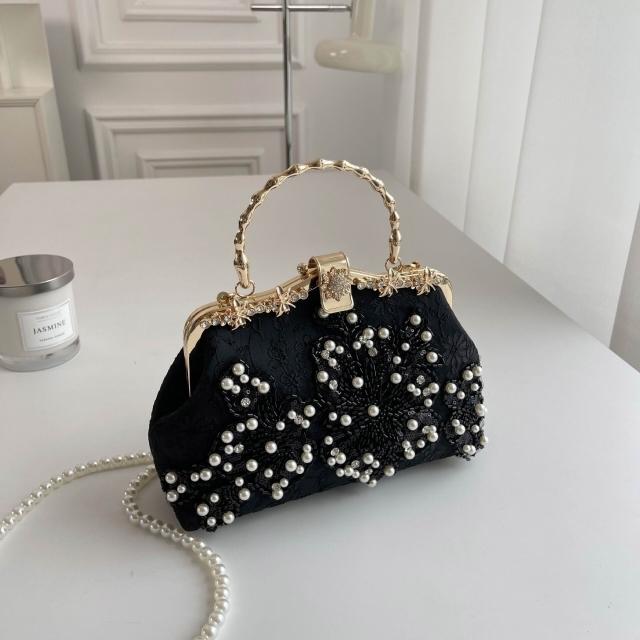 珍珠繡花時尚手提包旗袍宴會手拿包鏈條包繡珠包單肩包珍珠鏈條包