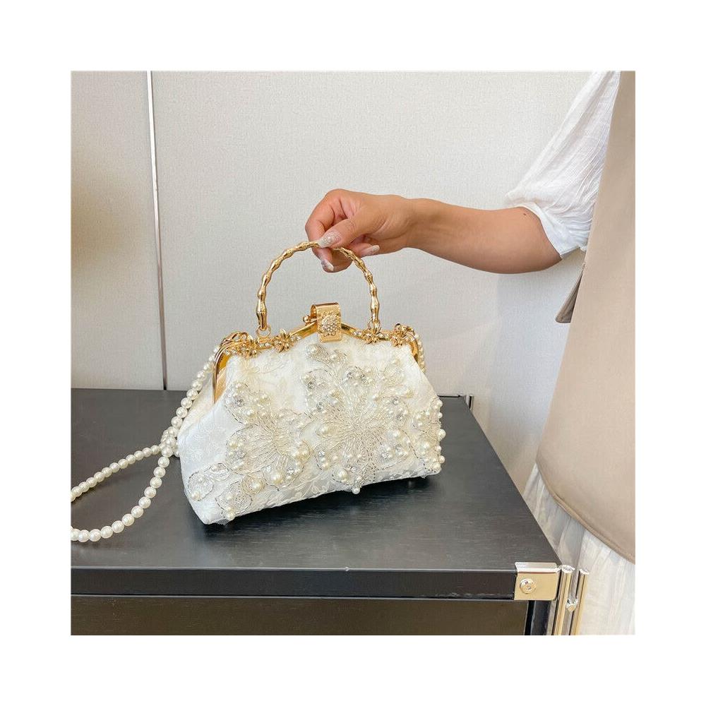 珍珠繡花時尚手提包旗袍宴會手拿包鏈條包繡珠包單肩包珍珠鏈條包