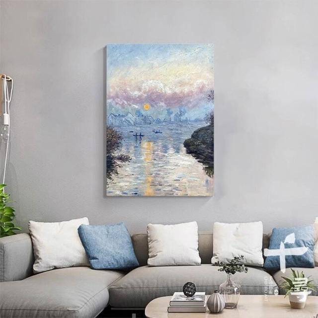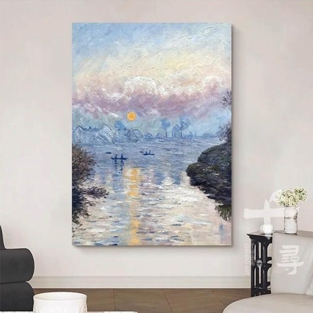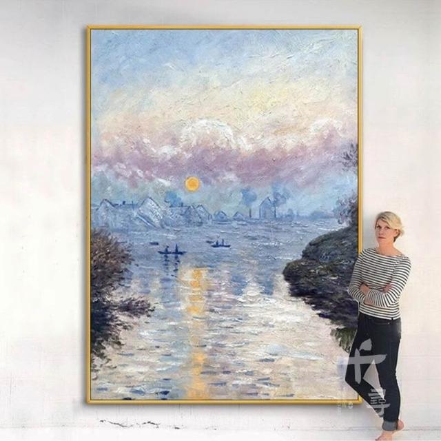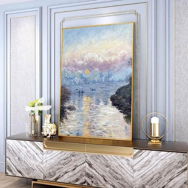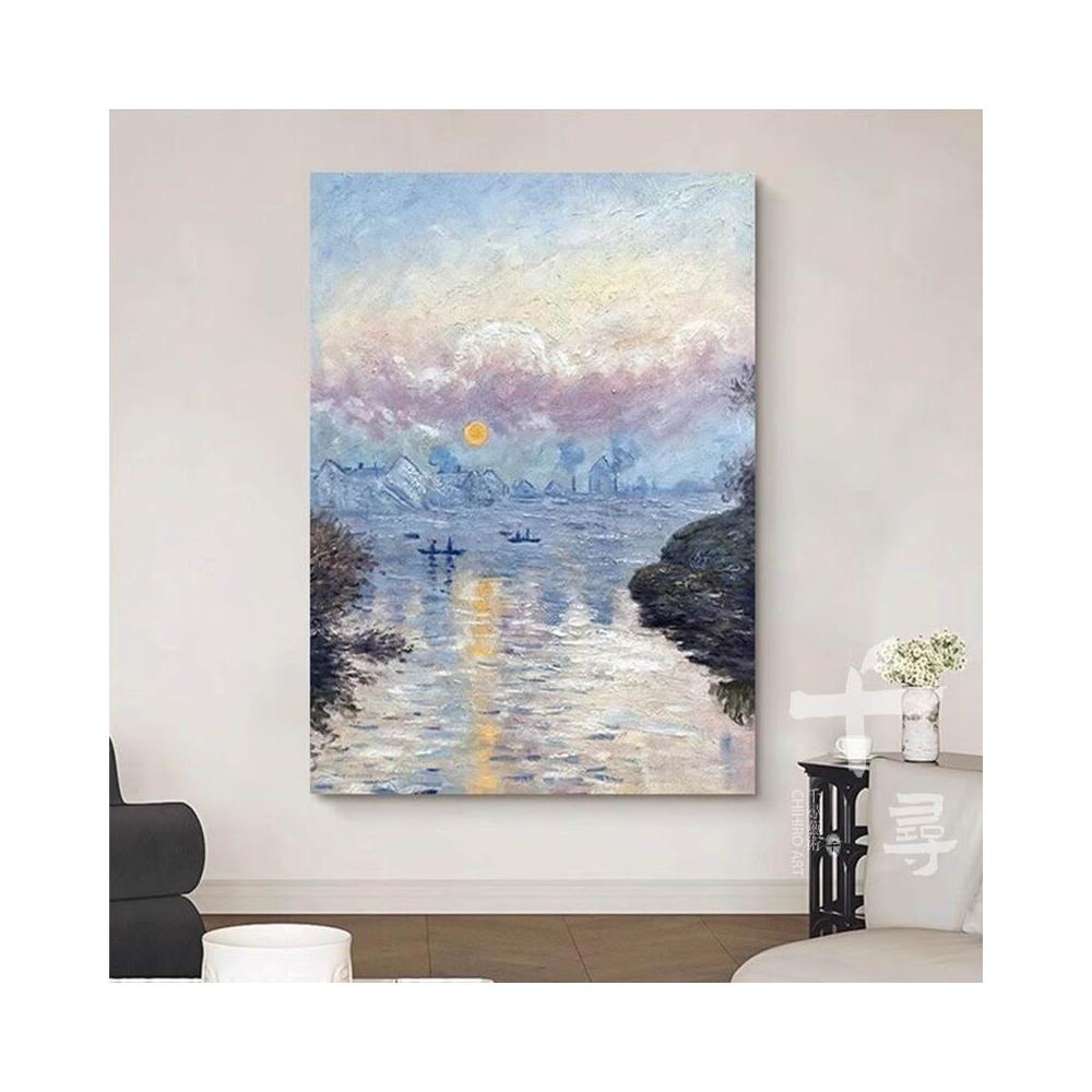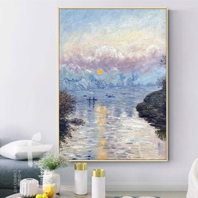 莫內日出手繪油畫 客廳玄關肌理畫 現代輕奢掛畫 藍色系背景牆裝飾畫