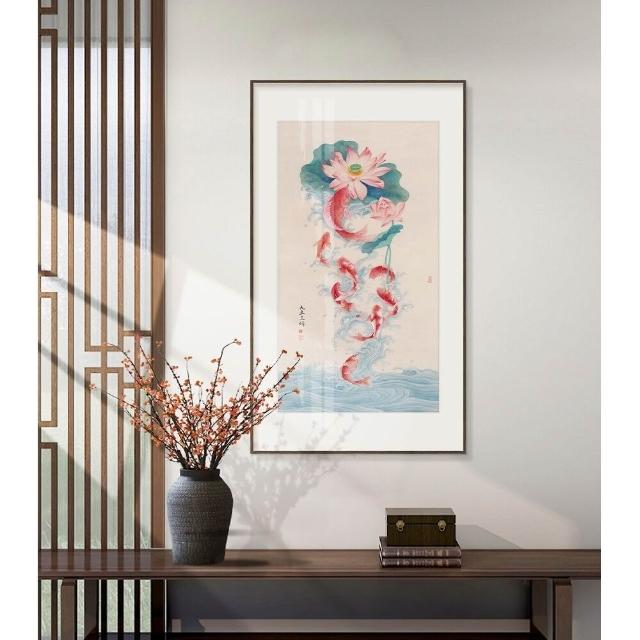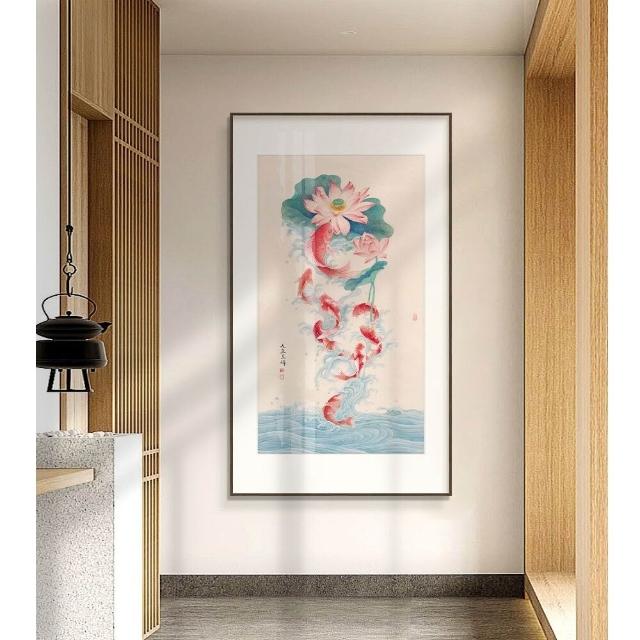 九魚圖玄關迎門掛畫 新中式入戶門裝飾畫 荷花牡丹茶室禪意壁畫 直式荷花九魚圖牆畫 招財風水畫