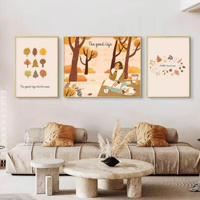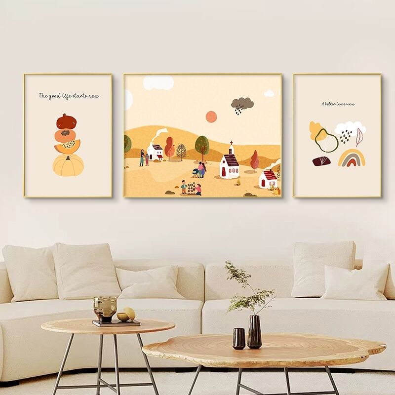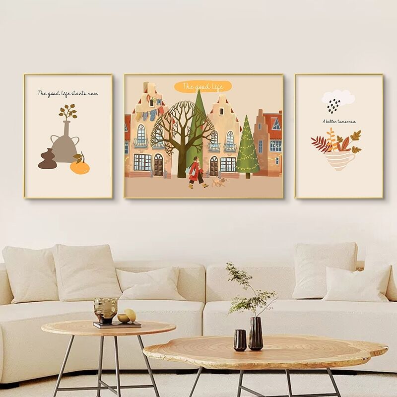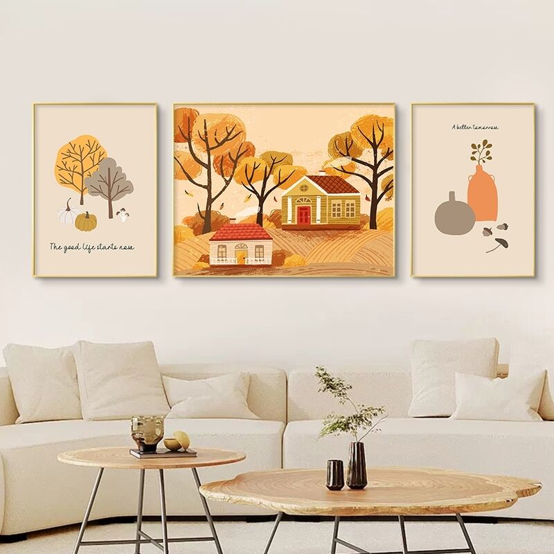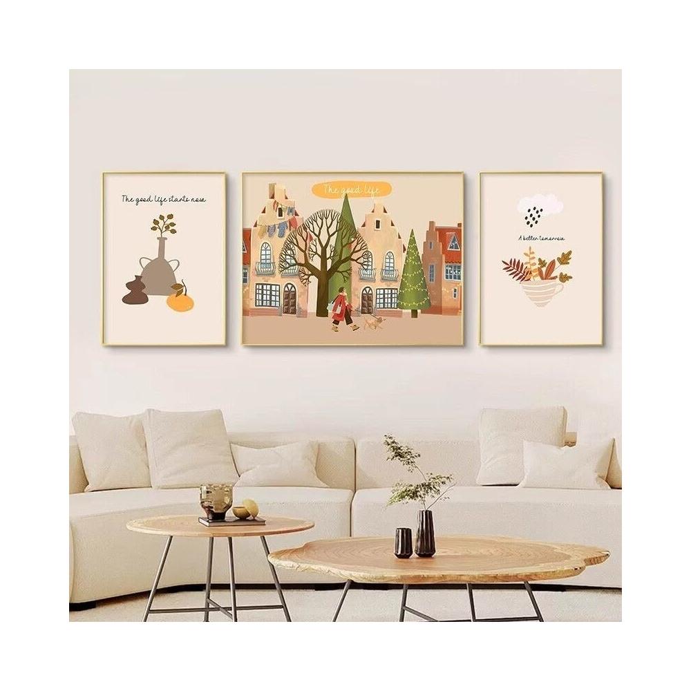 溫馨客廳裝飾畫 高級感三聯畫 奶油風高檔壁畫 客廳掛畫 網紅沙發背景牆