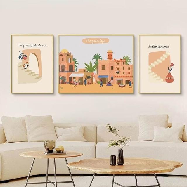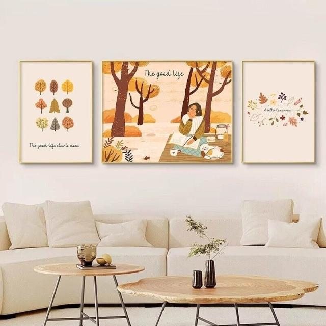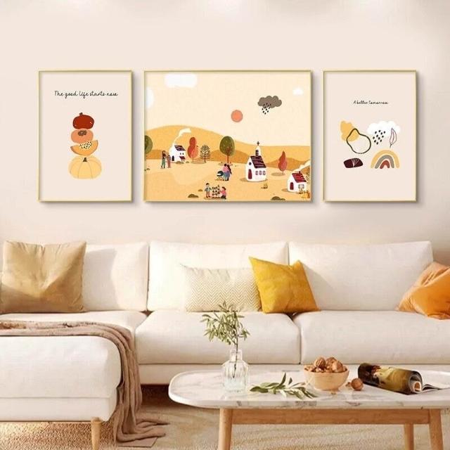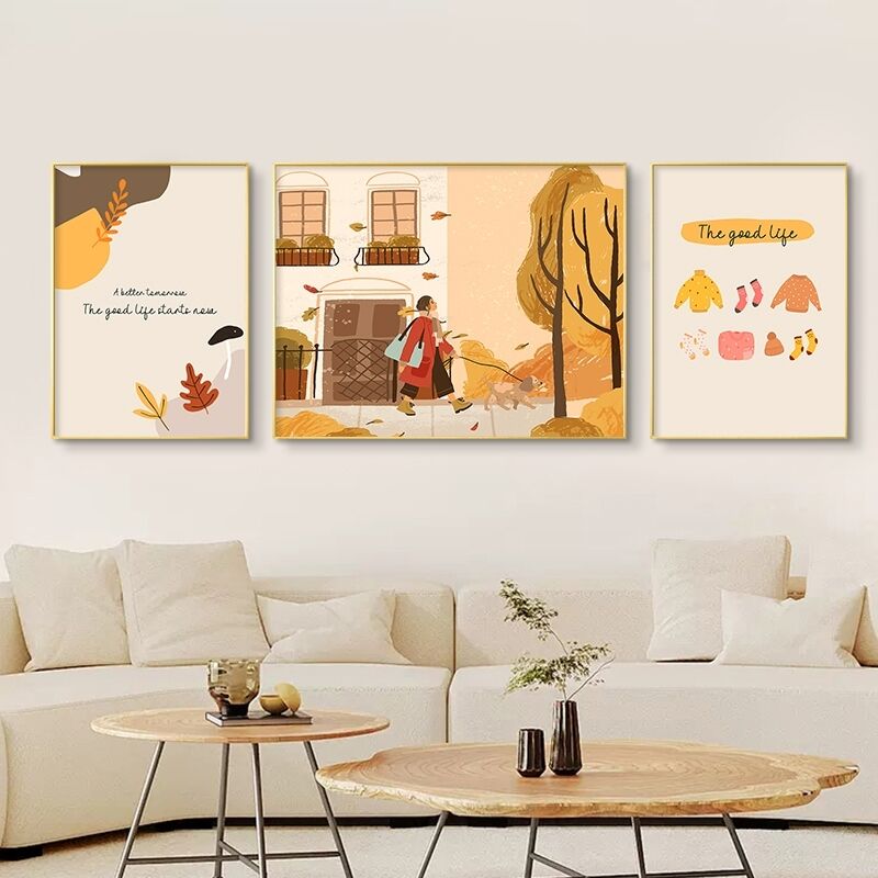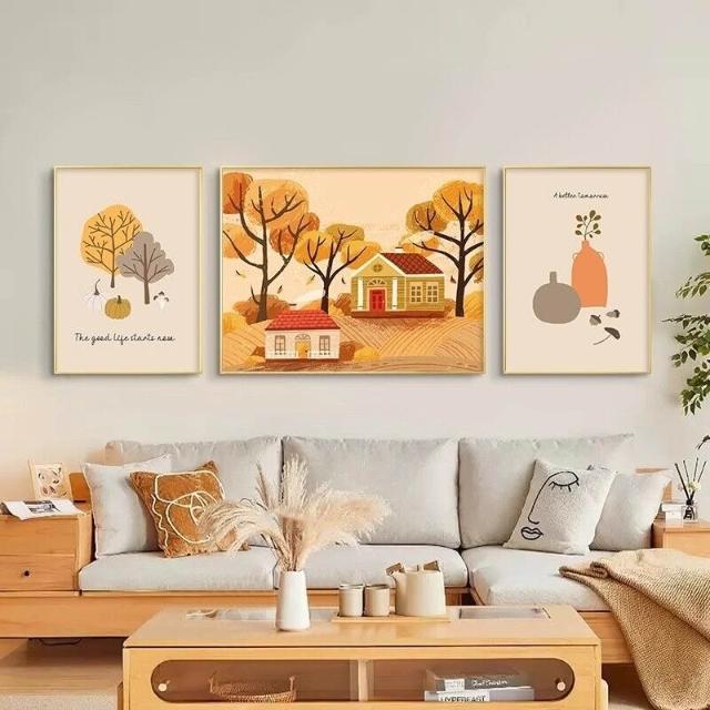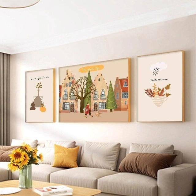 溫馨客廳裝飾畫 高級感三聯畫 奶油風高檔壁畫 客廳掛畫 網紅沙發背景牆