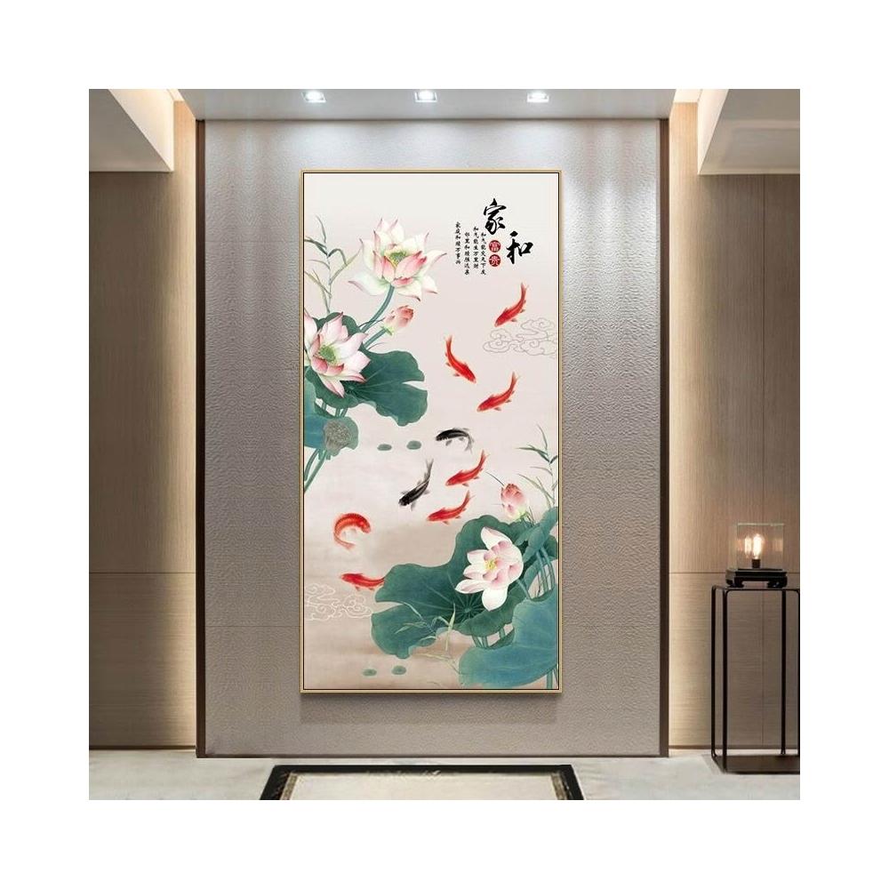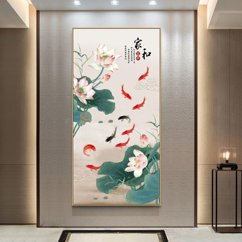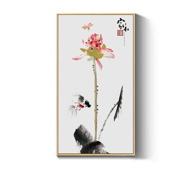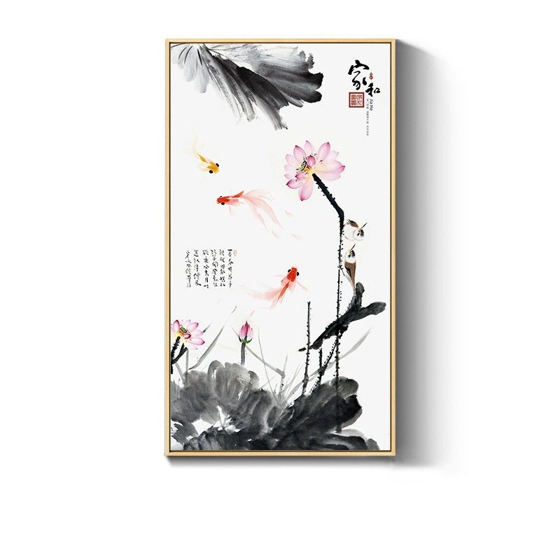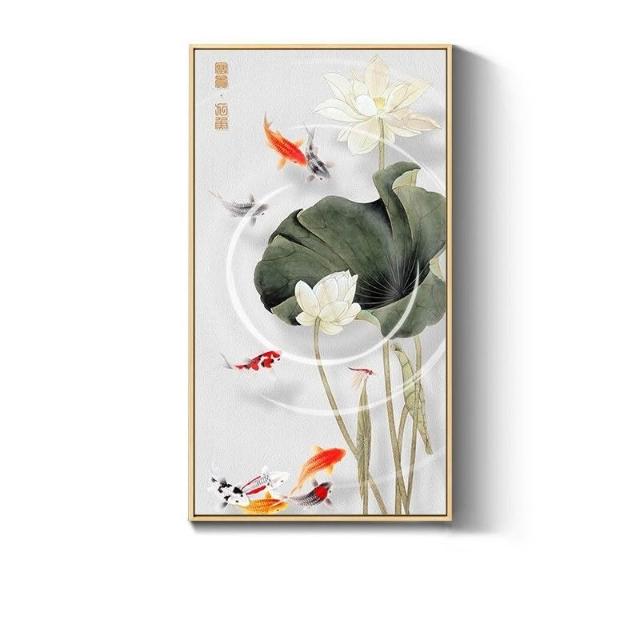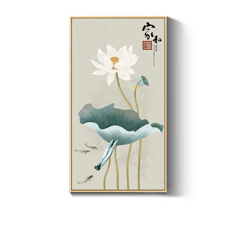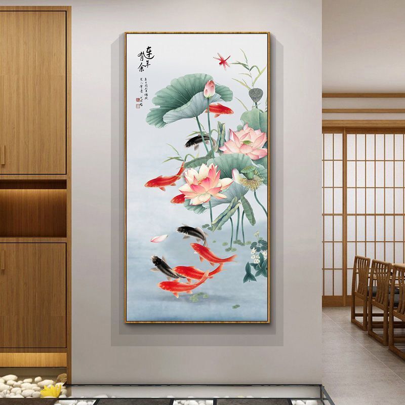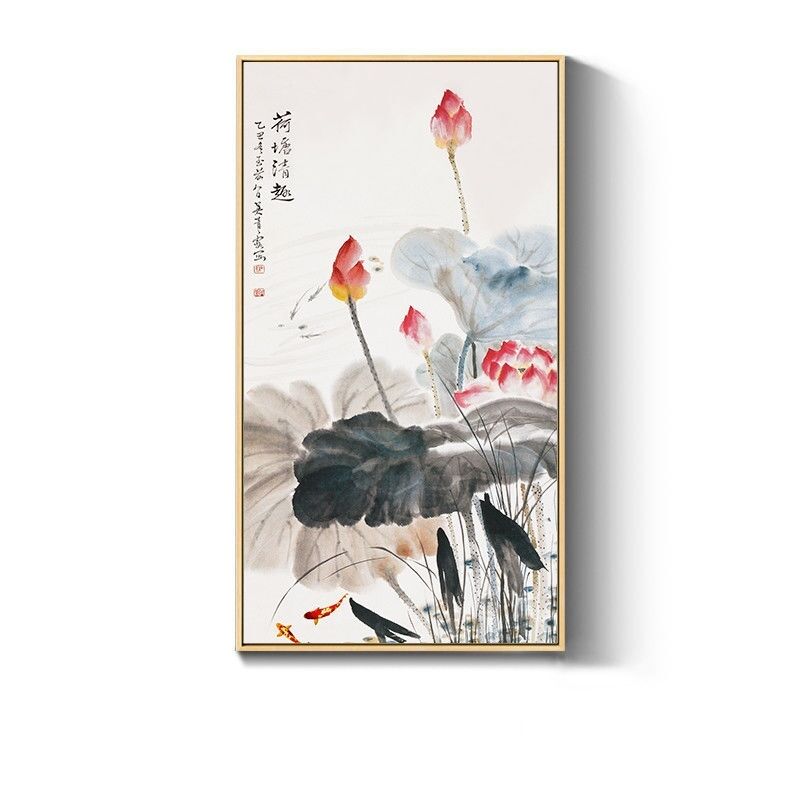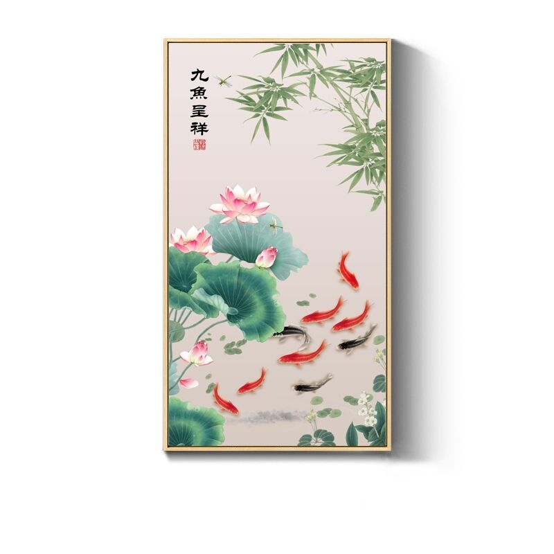 玄關裝飾畫 新中式豎版九魚圖 荷花壁畫 走廊盡頭掛畫 荷韻 蓮花