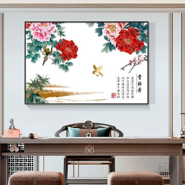 牡丹花掛畫 臥室花開富貴橫版裝飾畫 沙發背景墻畫 茶室壁畫 花鳥國畫 玄關餐廳掛畫 家和萬事興 風水畫
