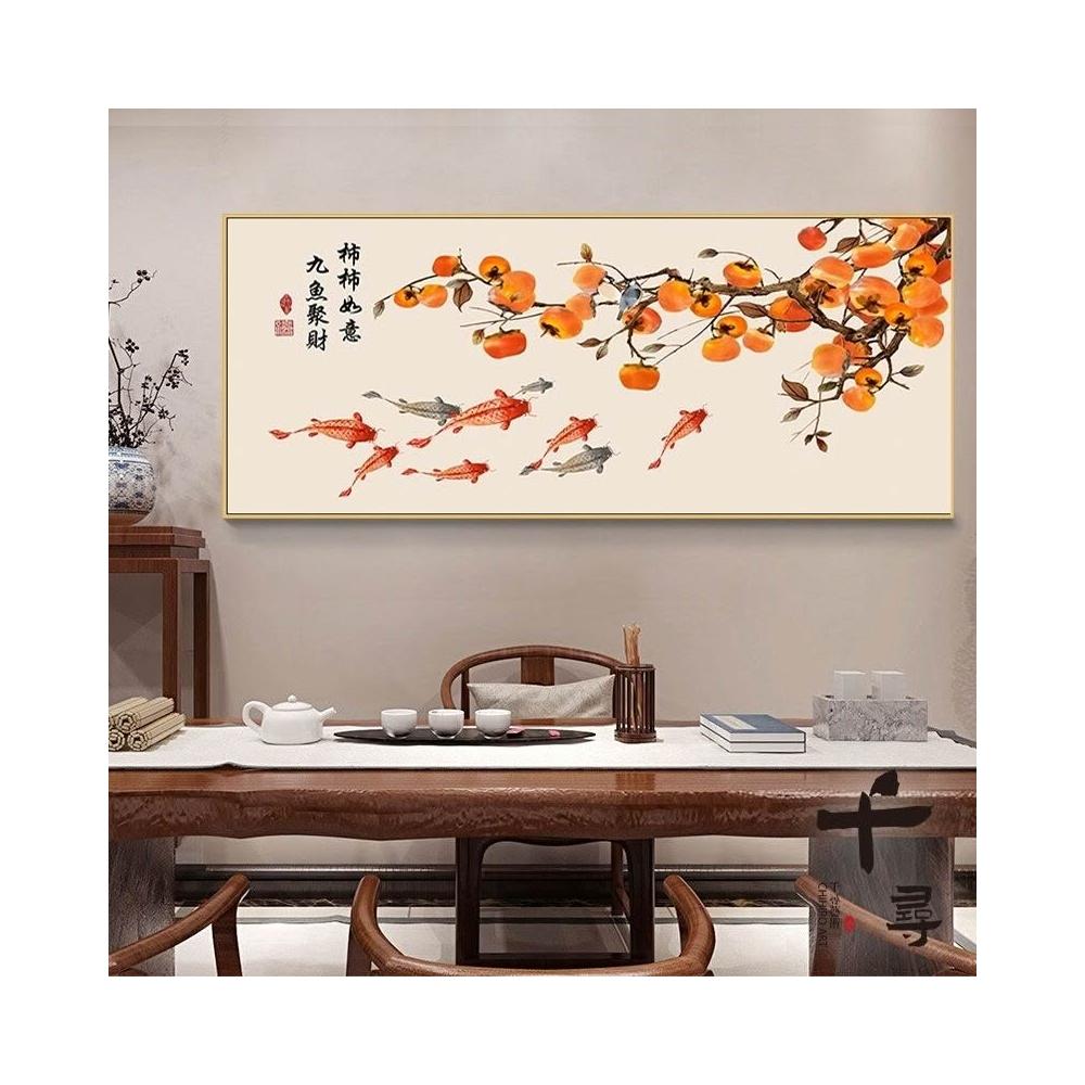 事事如意掛畫 九魚聚財裝飾畫 家和富貴餐廳壁畫 五福臨門沙發背景牆掛畫 柿柿如意新中式柿子牆畫