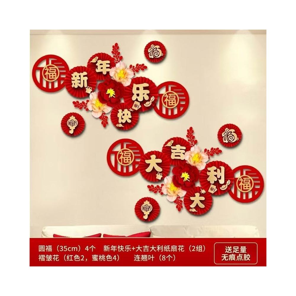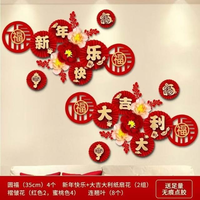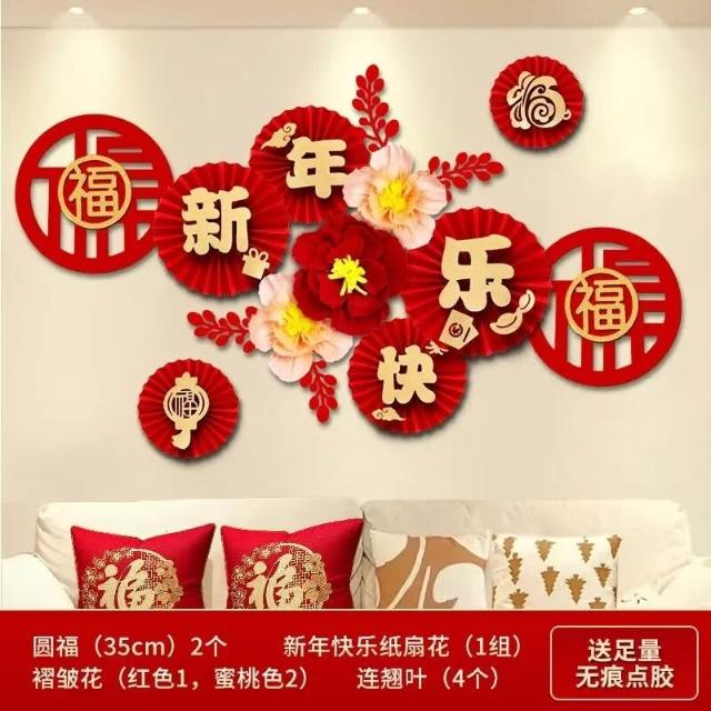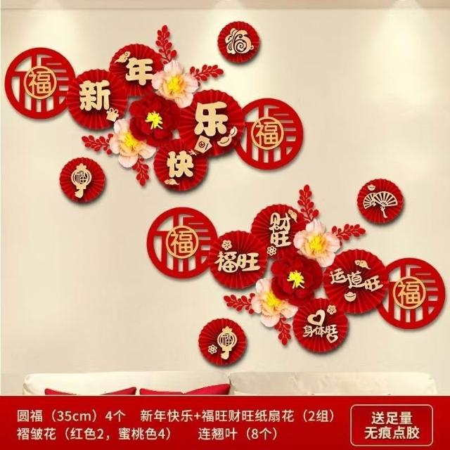 新年裝飾品 墻貼 2026新年圓福字紙扇花背景墻裝飾電視墻客廳場景剪紙佈置用品