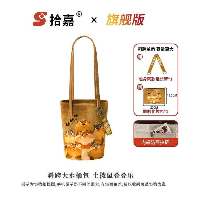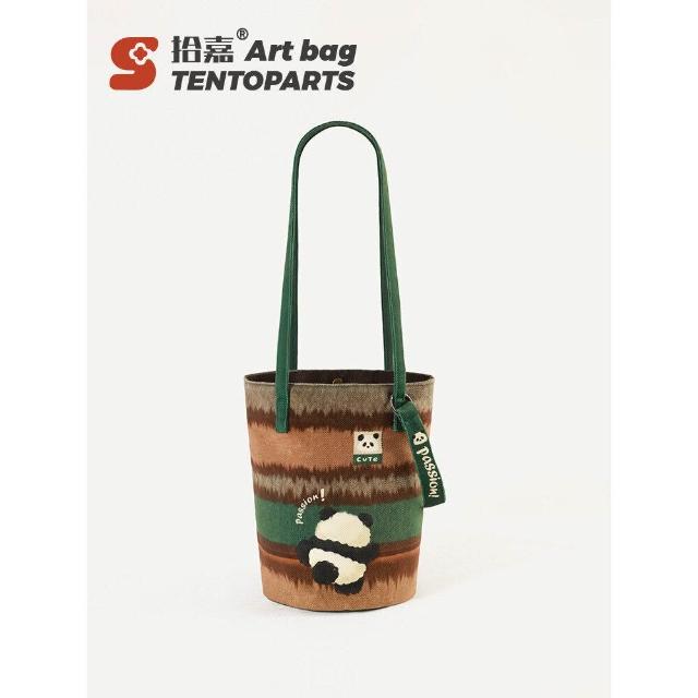 精品包包拾嘉X熊貓暖寵美拉德設計原創復古插畫聯名帆布 水桶包 單肩包斜挎