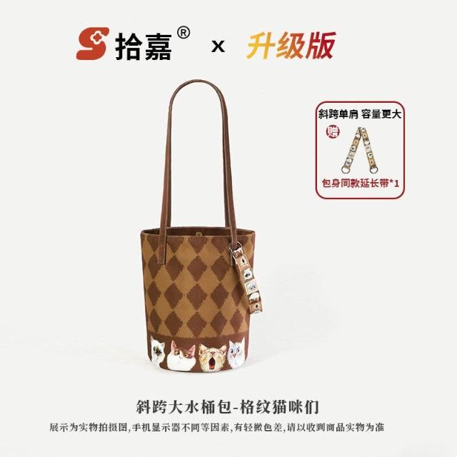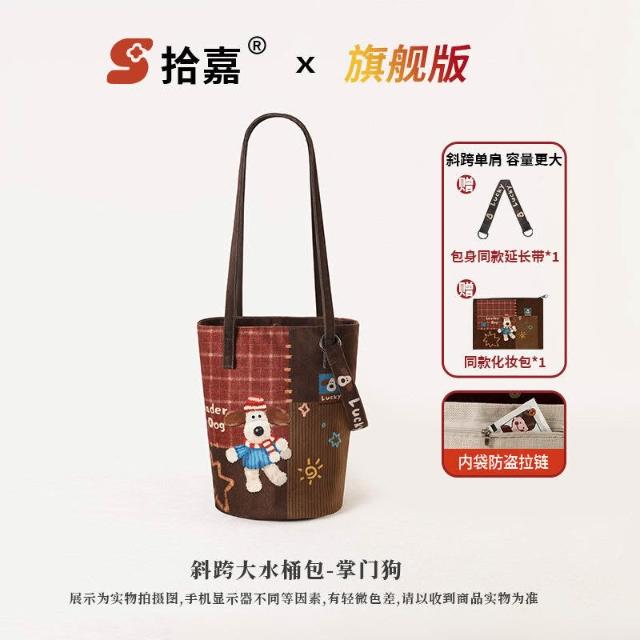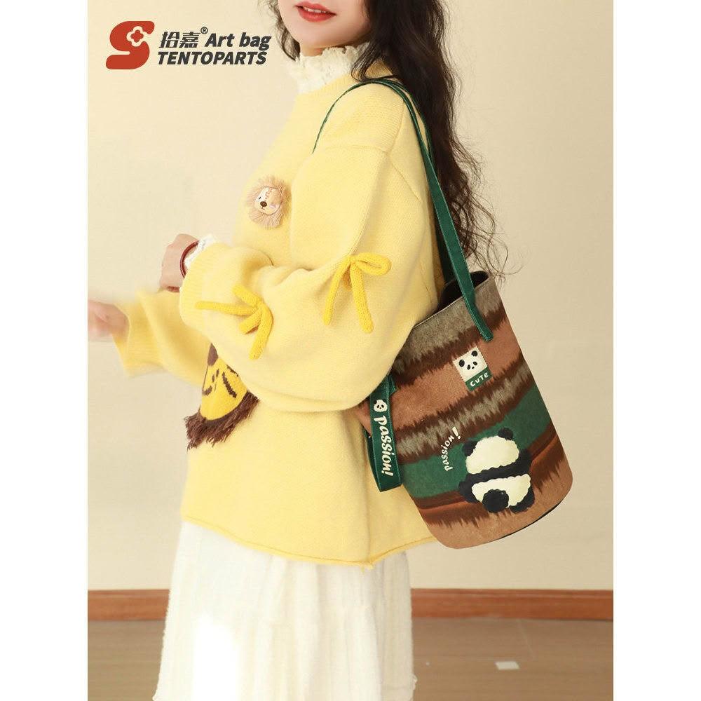 精品包包拾嘉X熊貓暖寵美拉德設計原創復古插畫聯名帆布 水桶包 單肩包斜挎