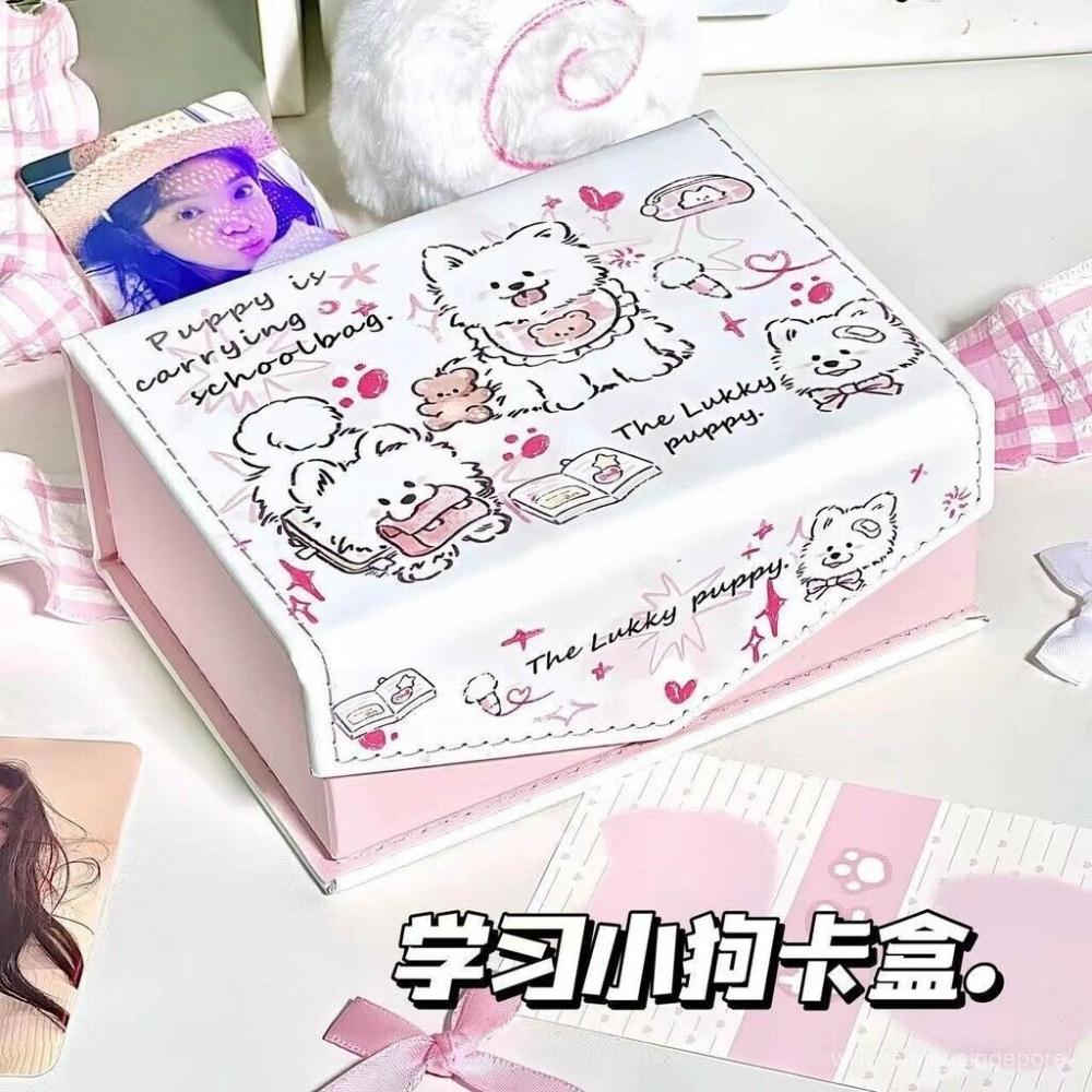學習小狗pu皮質卡盒追星卡防塵帶蓋可愛磁吸桌麵收納盒