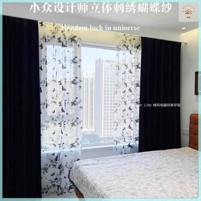 附發票法式紗簾 半遮光窗紗 蝴蝶刺繡窗紗 臥室窗紗 客廳陽臺復古落地飄窗窗紗 黑色繡花窗紗 透光窗紗