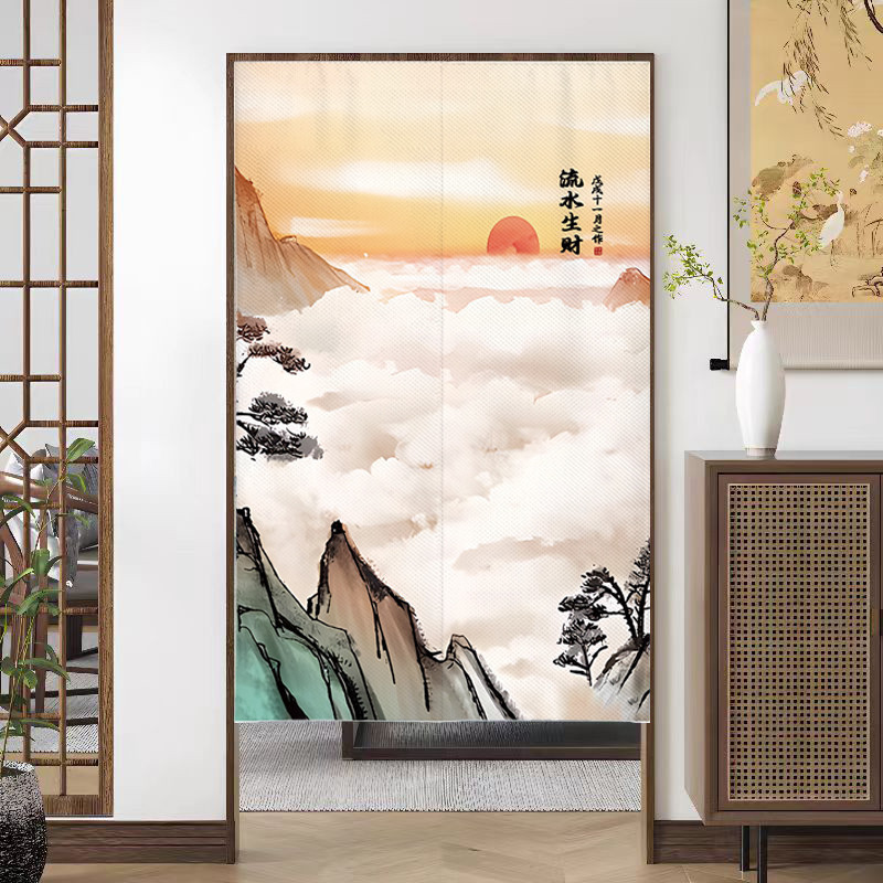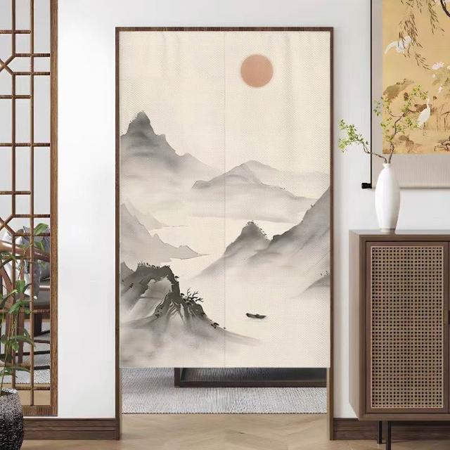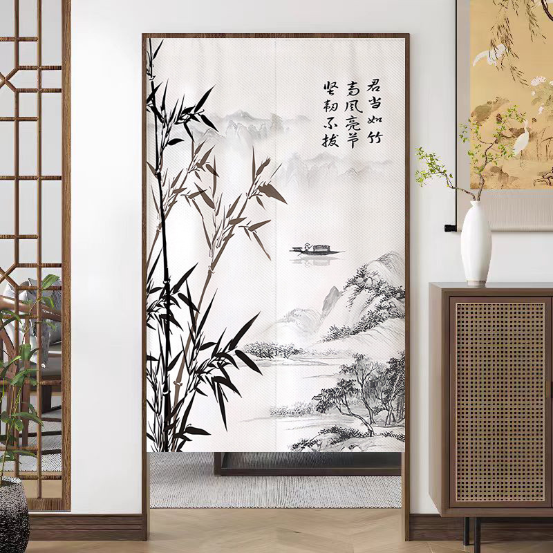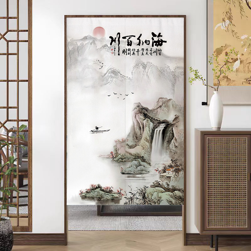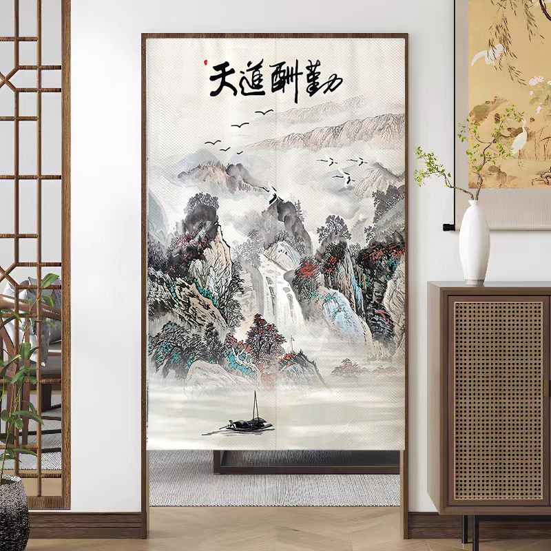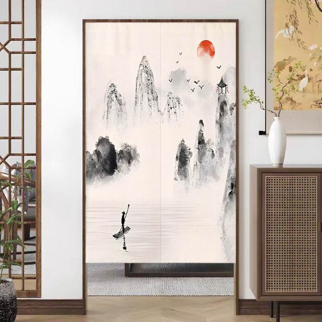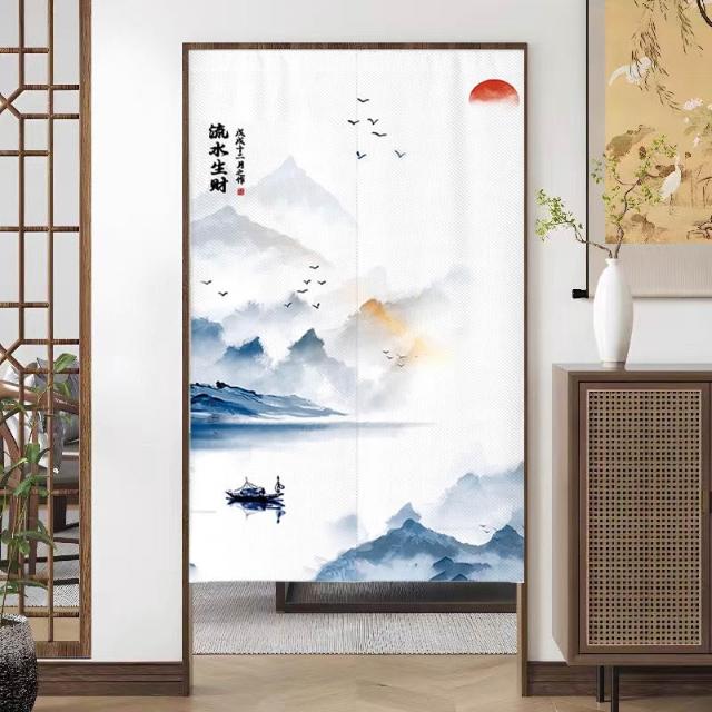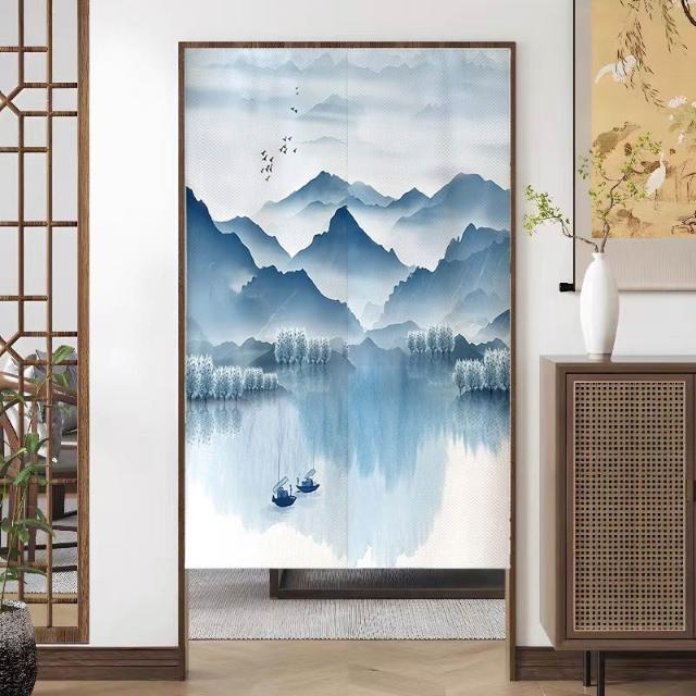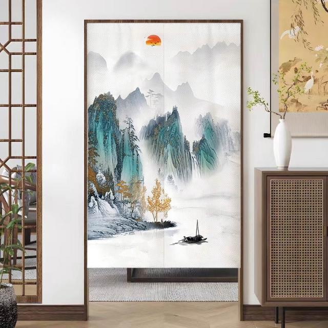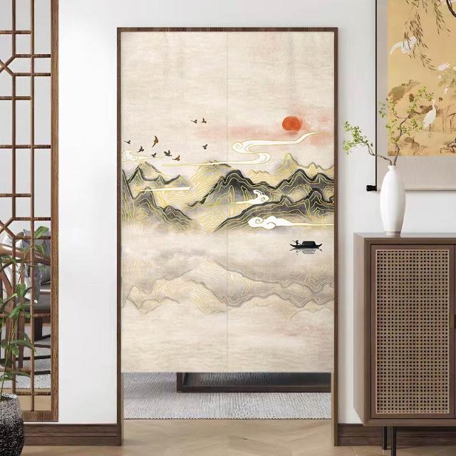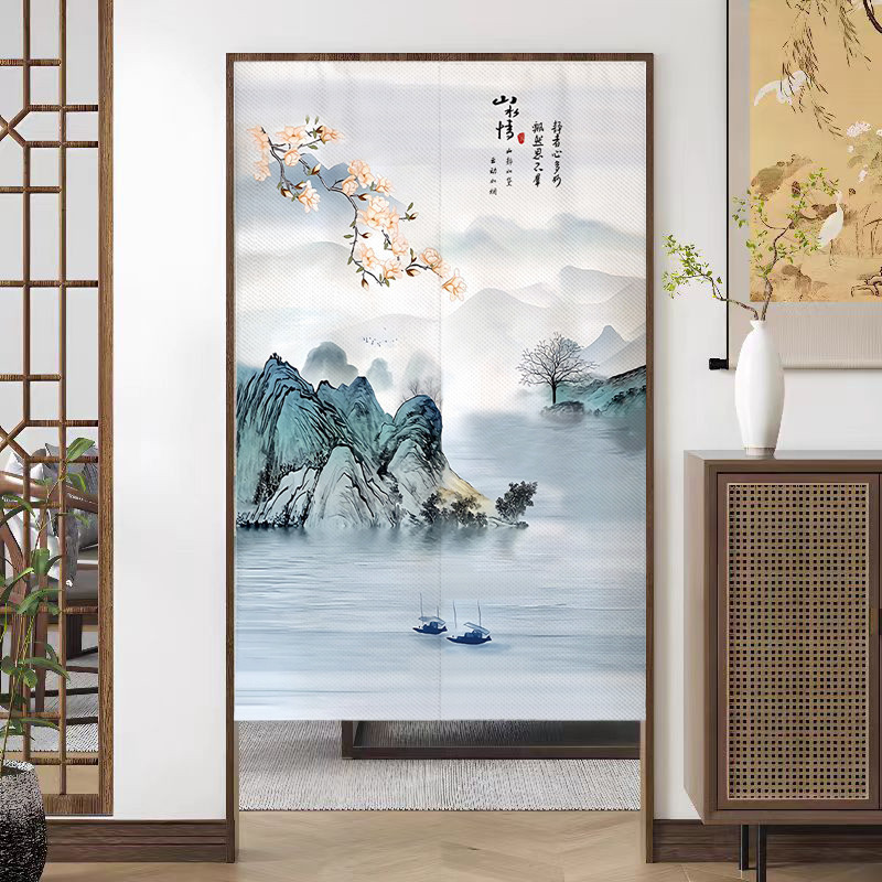 附發票中式山水家用房間過道門簾免打孔臥室隔斷簾衛生間半遮擋布藝簾子